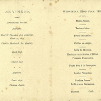 Boissons : Vins : Amontillado Pasado. Nierstein. Moët & Chandon Dry Imperial Cuvée 20, 1893. Charles Heidsieck Ex. Quality. Hock Cup (cocktail). Claret Cup (cocktail). Liqueurs. Dow's 1878. Château Lafite. Café.