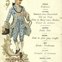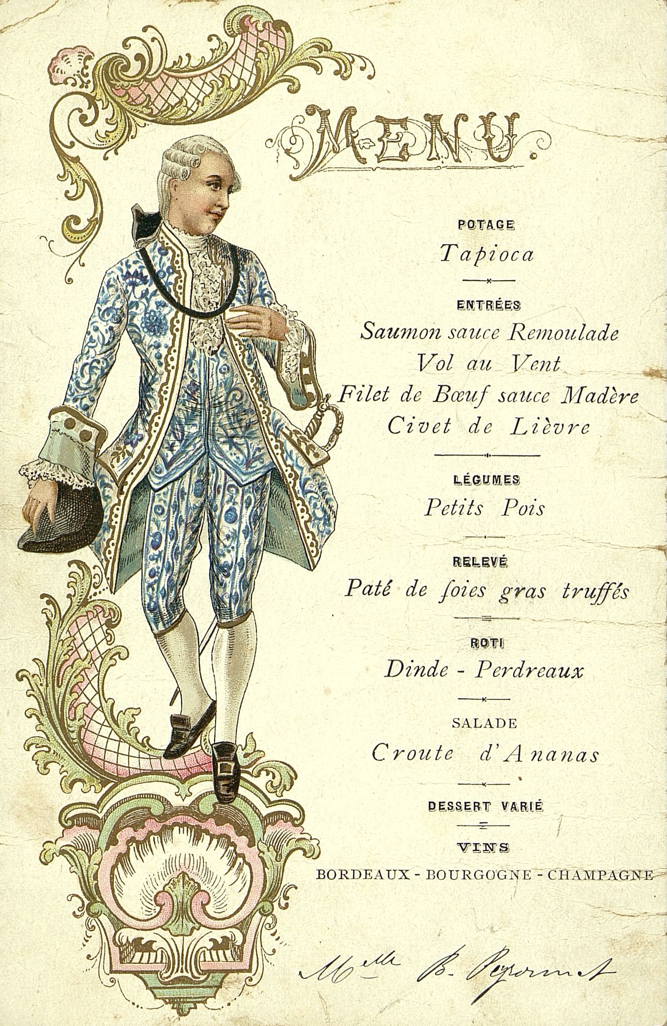 Plats servis : Tapioca. Saumon sauce Rémoulade. Vol au Vent. Filet de Bœuf sauce Madère. Civet de Lièvre. Légumes : Petits Pois. Relevé : Pâté de foies gras truffés. Rôti : Dinde-Perdreaux. Salade. Croute d'Ananas. Dessert varié.