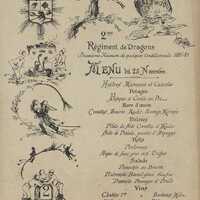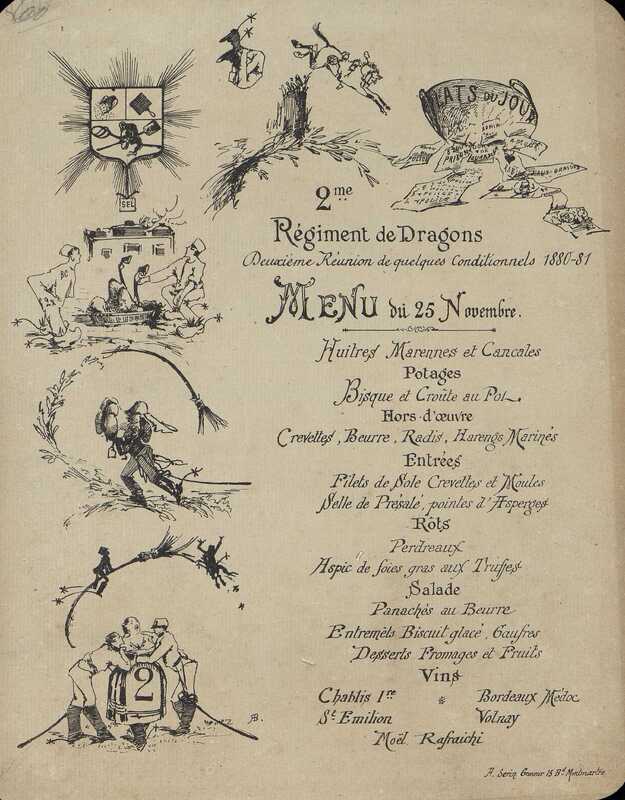 Plats servis : Huitres Marennes et Cancales. Potages : Bisque et Croûte au Pot. Hors-d'œuvre : Crevettes. Beurre. Radis. Harengs Marinés. entrées : Filets de Sole Crevettes et Moules. Selle de Présalé, pointes d'Asperges. Rôts : Perdreaux. Aspic de Foies gras aux truffes. Salade. Panachés au Beurre. Entremet Biscuit Glacé. Gaufres. Dessert. Fromages et Fruits.