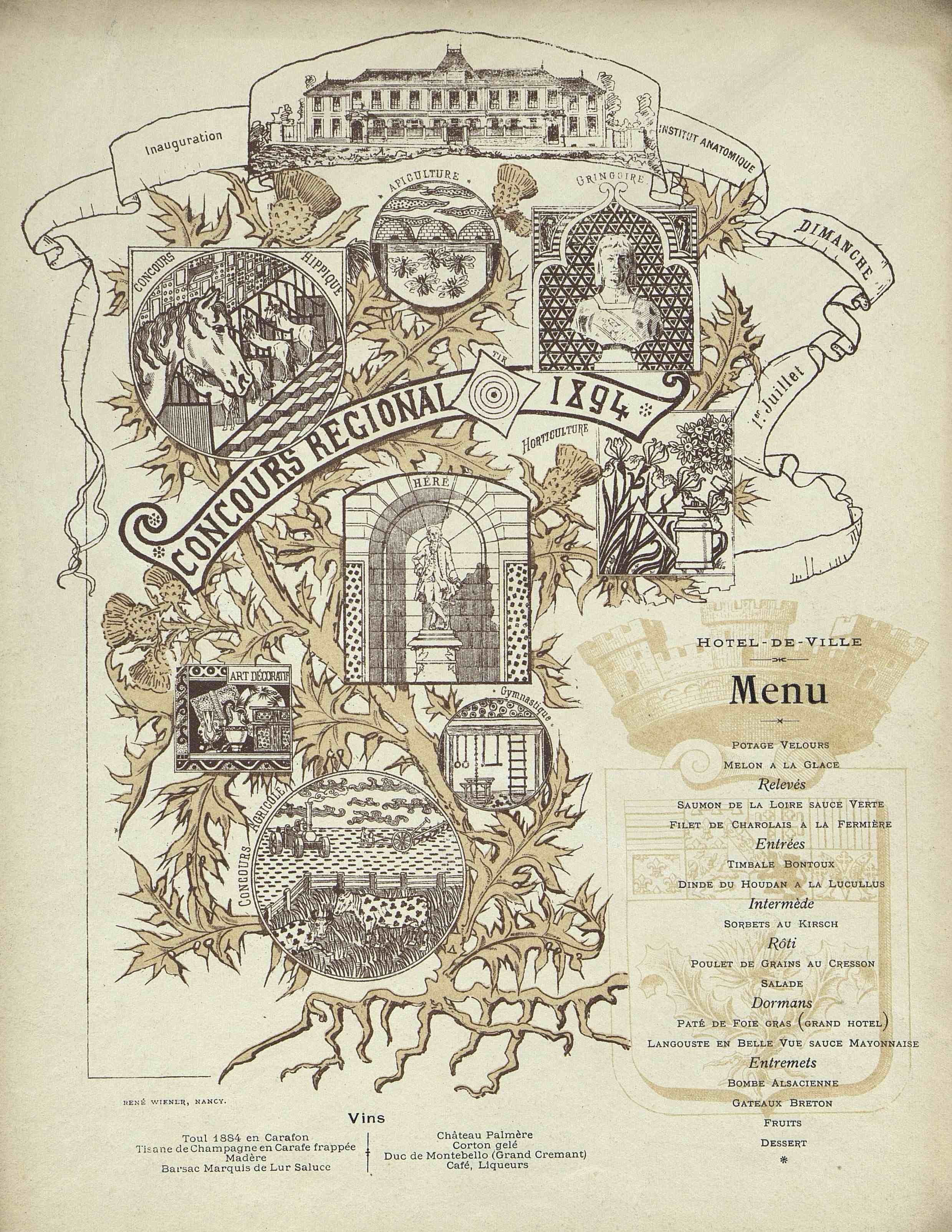 Boissons : Vins : Toul 1884 en Carafon. Tisane de Champagne en Carafe frappée. Madère. Barsac Marquis de Lur Saluce, Château Palmère. Corton gelé. Duc de Montebello (Grand Crémant). Café. Liqueurs.