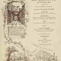 Plats servis : Potage Saint-Germain. Hors d’œuvre variés. Relevé : Saumon Sauce aux Câpres. Entrées : Selle d'Agneau à la Milanaise. Jambon d'York aux Epinards. Rôt : Chapons du Mans au Cresson. Salade. Entremets : Petits Pois à la Française. Charlotte de Pommes. Glace Caroline. Desserts.