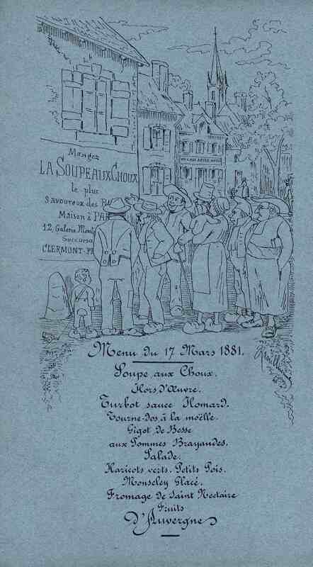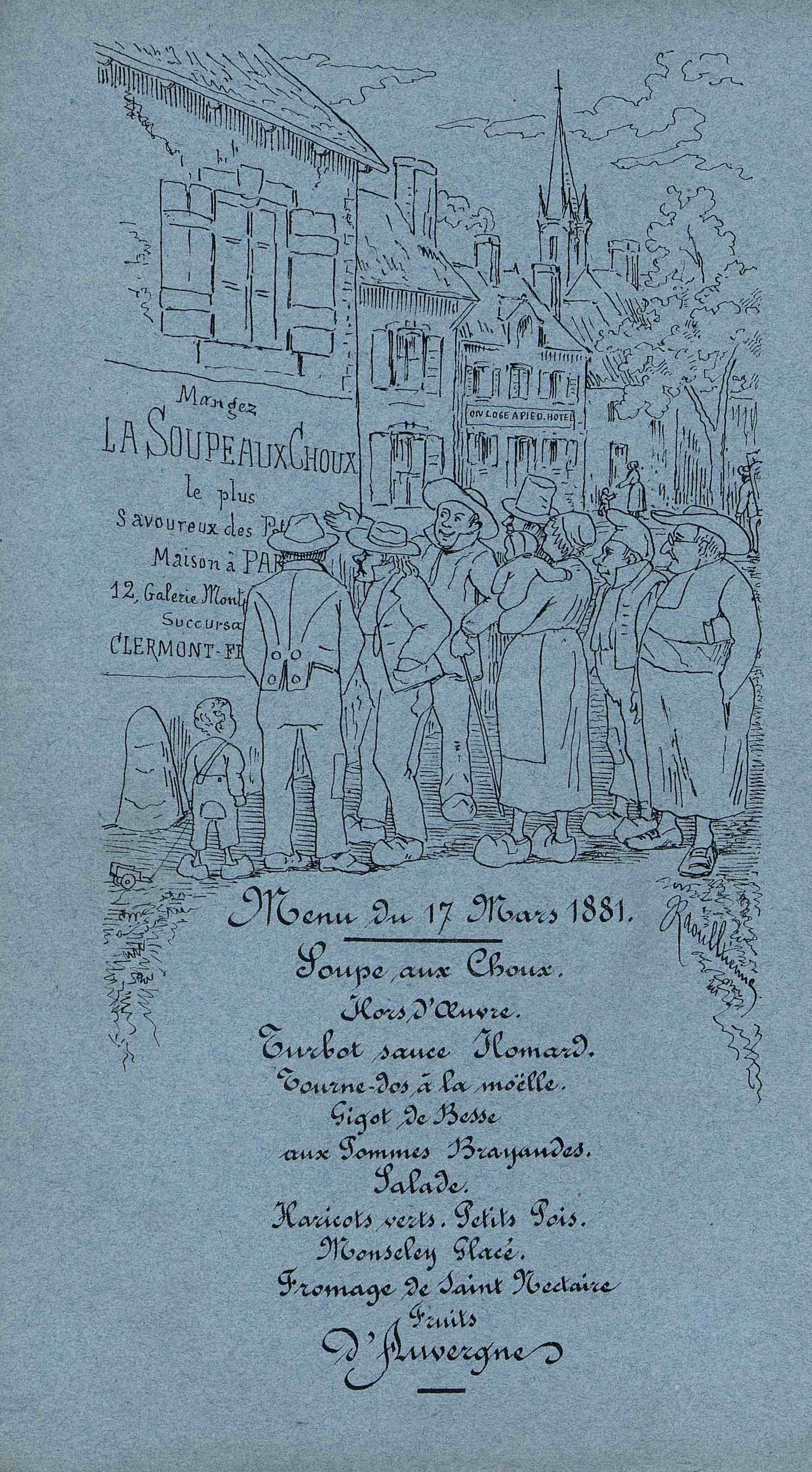 Plats servis : Soupe aux Choux. Hors d’œuvre. Turbot sauce Homard. Tournedos à la moelle. Gigot de Besse aux Pommes Brayandes. Salade. Haricots verts et Petits pois. Monseley Glacé. Fromage de St-Nectaire. Fruits d'Auvergne.