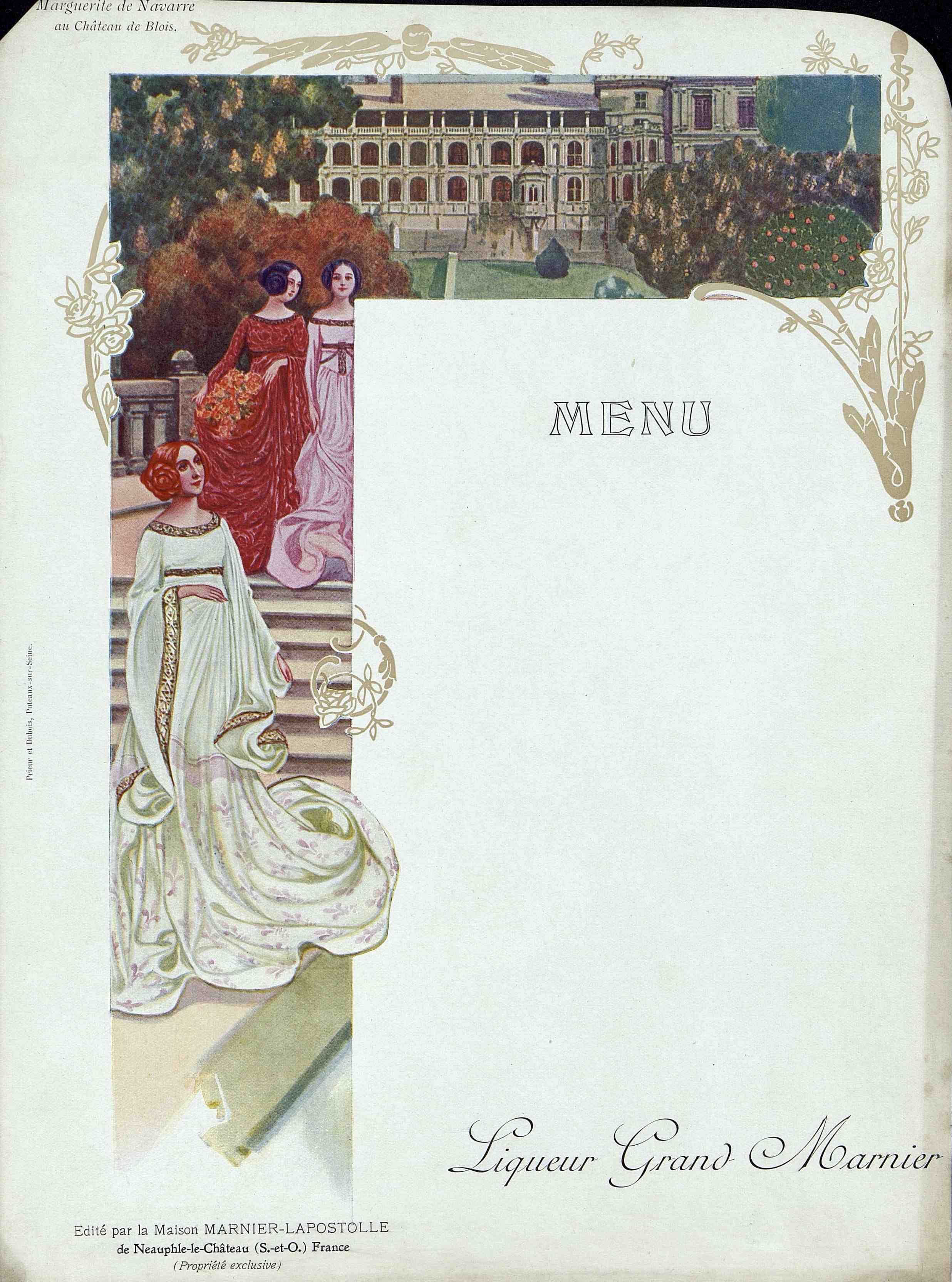 Menu publicitaire vierge illustré : Marguerite de Navarre au Château de Blois. Liqueur Grand Marnier