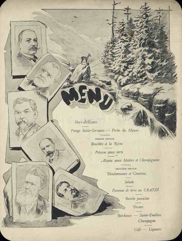 Plats servis : Hors d’œuvre. Potage Saint-Germain. Perle du Mysore. Premier service : Bouchées à la Reine. Poisson sauce verte. Aloyau sauce Madère et Champignons. Deuxième service : Dindonneaux et Canetons. Salade. Pommes de terre au GRATIN. Bombe panachée. Dessert.