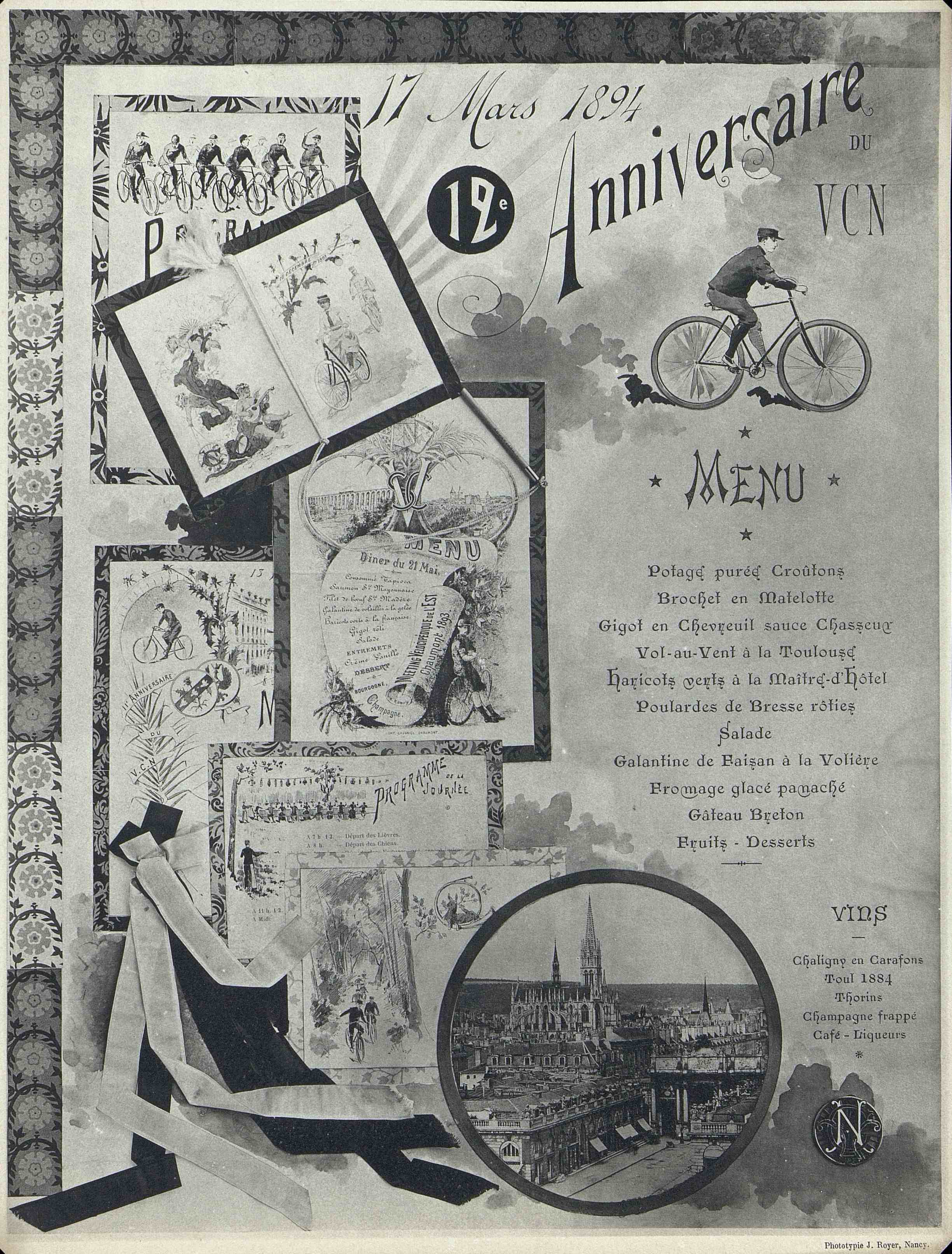 Illustration : Cycliste. Menus et programmes rétrospectifs. Vue de Nancy.