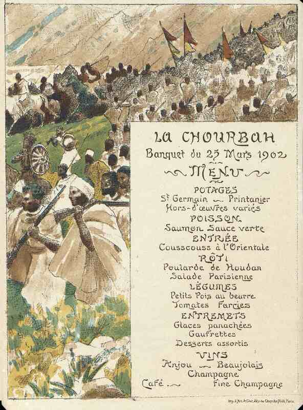 Illustration : ? Fantasia. Banquet de peintres orientalistes. Inspiration probable du tableau du même nom de Etienne Alphonse Dinet (1861-1929).
