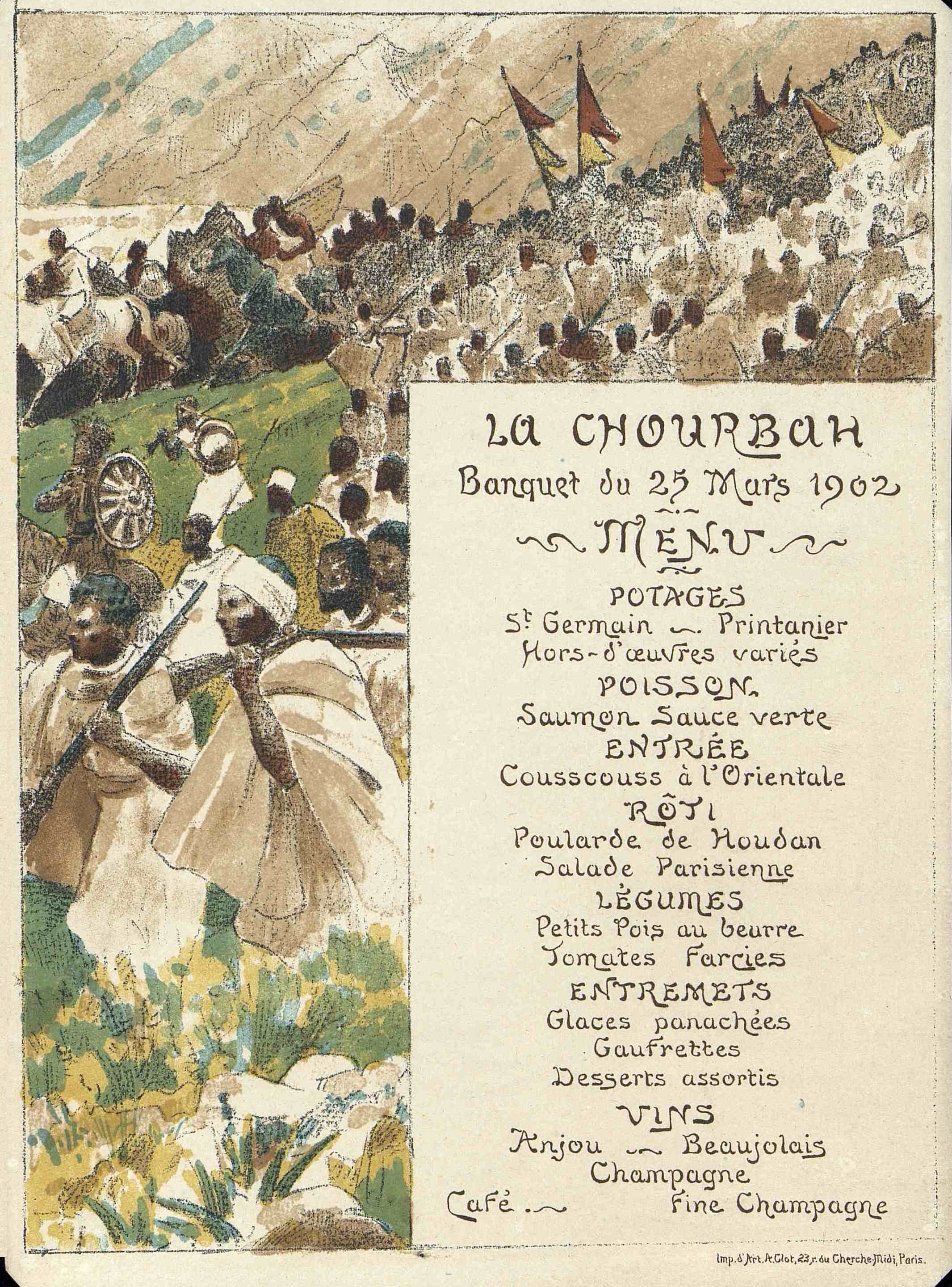 Plats servis : Potages : St-Germain, Printanier. Hors d’œuvres variés. Poisson : Saumon sauce verte. Entrée : Couscous à l'Orientale. Rôti : Poularde de Houdan. Salade Parisienne. Légumes : Petits Pois au beurre. Tomates Farcies. Entremets : Glaces panachées. Gaufrettes. Desserts assortis.