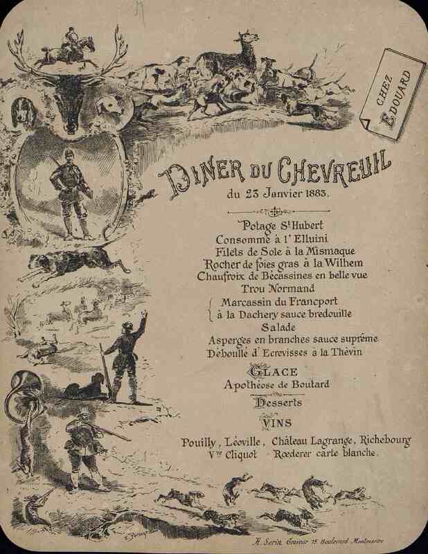 Plats servis : Potage St-Hubert. Consommé à l'Elluini. Filet de Sole à la Mismaque. Rocher de foies gras à la Wilhem. Chaufroix de Bécassines en belle vue. Trou Normand. Marcassin du Francport à la Dachery sauce bredouille. Salade. Asperges en branches sauce suprême. Deboullé d'Ecrevisses à la Thévin. Glace. Apothéose de Boutard. Desserts.