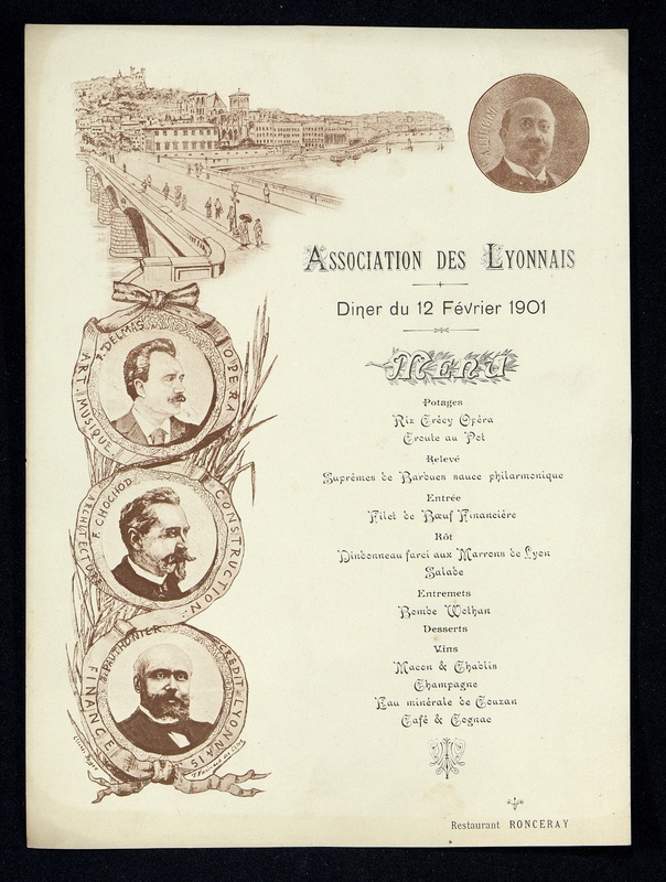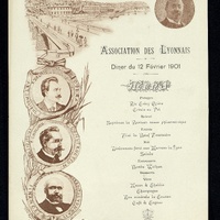 Menu illustré de l'Association des Lyonnais. Vue du quartier St-Jean et de la colline de Fourvière depuis le pont Bonaparte. Portraits en médaillons, reliés par un ruban et supportés par des palmes, d'hommes célèbres : Francisque Delmas , chanteur d'opéra , F. Chochod, construction et architecture. J. Pauthonier, finance, Crédit lyonnais. Médaillon photographique de A. Luigini.