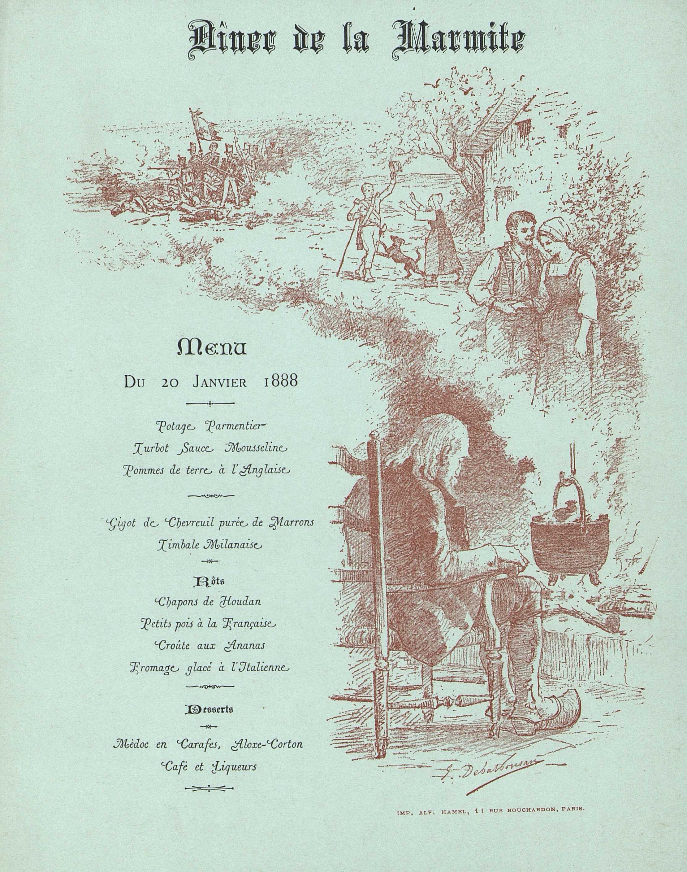 Plats servis : Potage Parmentier. Turbot Sauce Mousseline. Pomme de terre à l'Anglaise. Gigot de Chevreuil purée de Marrons. Timbale Milanaise. Rôts : Chapons de Houdan. Petits pois à la Française. Croûte aux Ananas. Fromage. glacé à l'Italienne. Dessert.