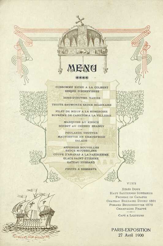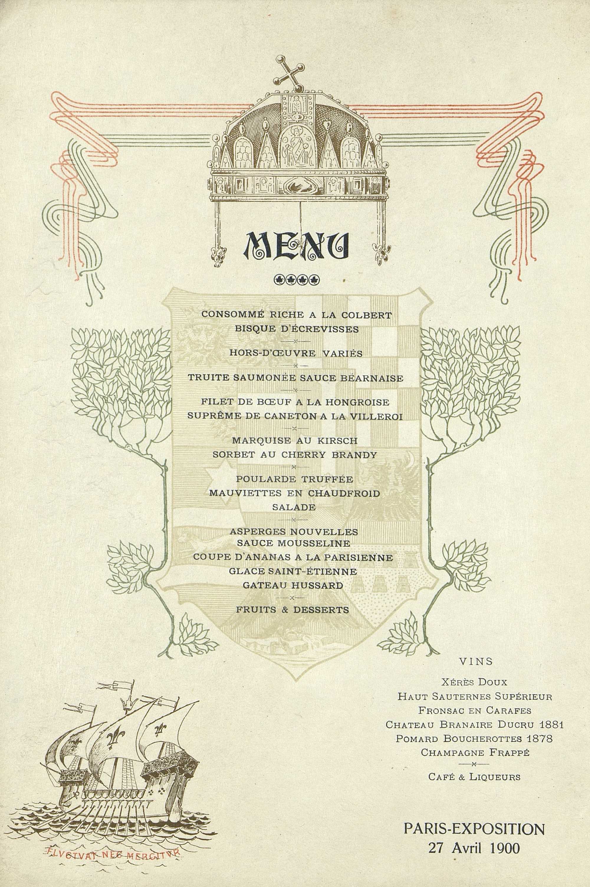 - Boissons : Vins : Xérès Doux. Haut Sauternes Supérieur. Fronsac en Carafes. Château Branaire Ducru 1881. Pomard Boucherottes 1878. Champagne frappé. Café et Liqueurs.