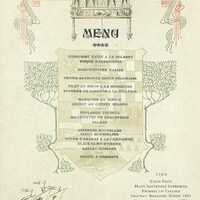 - Plats servis : Consommé Riche à la Colbert. Bisque d'Ecrevisses. Hors d’œuvre variés. Truite saumonée sauce Béarnaise. Filet de Bœuf à la Hongroise. Suprême de Caneton à la Villeroi. Marquise au Kirsch. Sorbet au Cherry Brandy. Poularde truffée. Mauviette en chaud-froid. Salade. Asperges nouvelles. Sauce Mousseline. Coupe d'Ananas à la Parisienne. Glace St-Etienne. Gâteau Hussard. Fruits et Desserts.