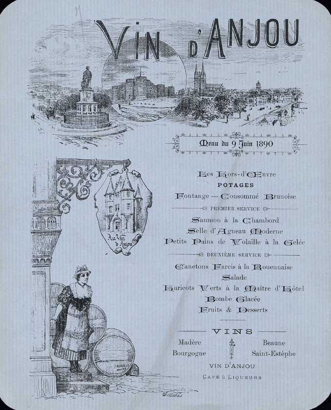 Boissons : Vins : Madère. Bourgogne. Beaune. Saint-Estèphe. Vin d'Anjou. Café. Liqueurs.