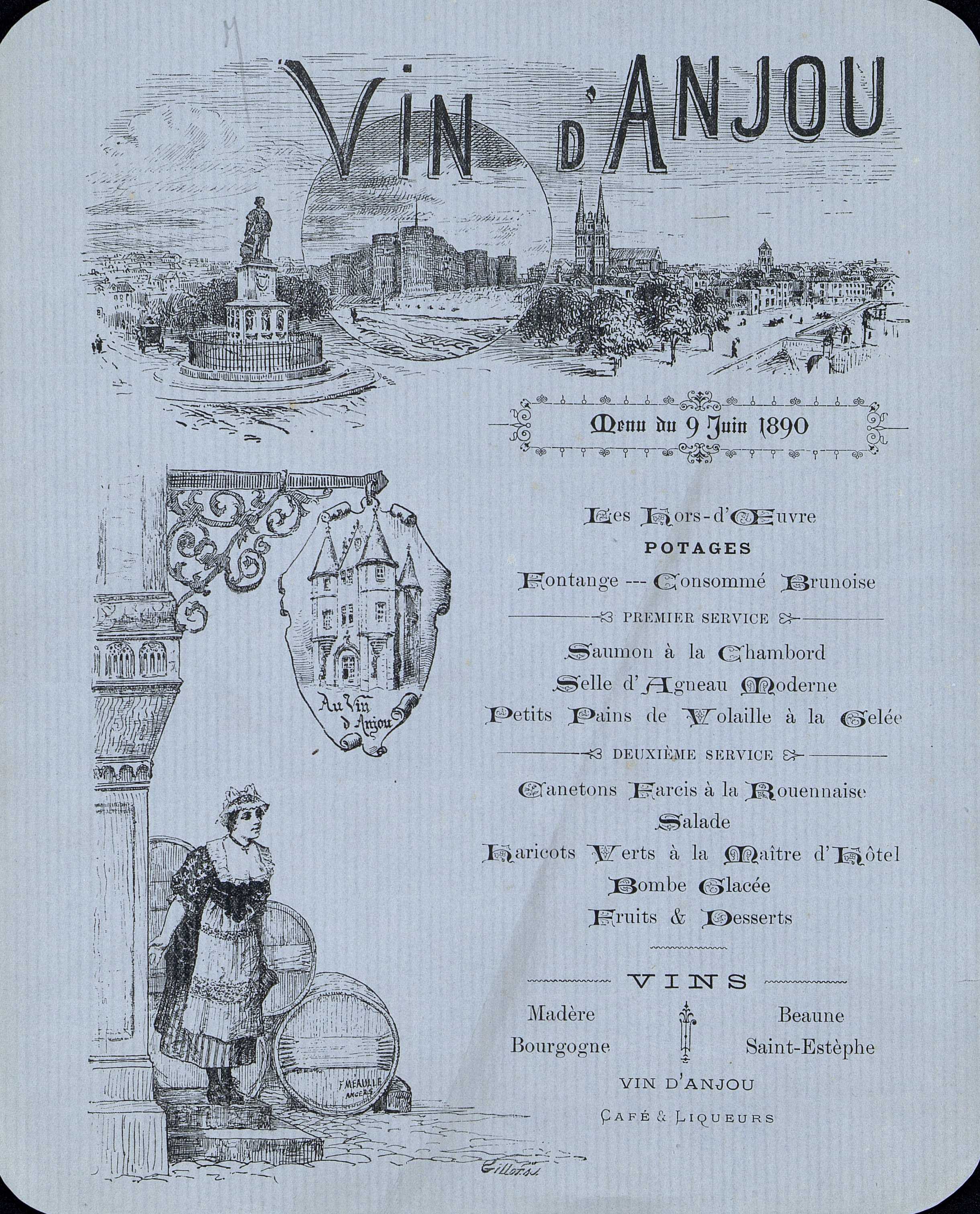 Illustrations : Angers statue du Roi René et château d'Angers en médaillon. Ville avec ses édifices religieux. Echoppe à vin à l'enseigne médiévale au châtelet, une angevine en tenue locale devant l'entrée.