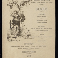 Plats servis : Potages Bisque et Julienne. Hors d’œuvre variés. Poisson. Brandade. Entrées : Côte de Béhague petits pois de Clamart. Filet de Bœuf financière. Rôtis : Chapons du Mans et Faisans au Cresson. Salade de Saison. Entremets : Fonds d'Artichauts Sauce Suprême. Haricots Verts Maître d'Hôtel. Brioche Mousseline. Bombe Panachée. Desserts variés.