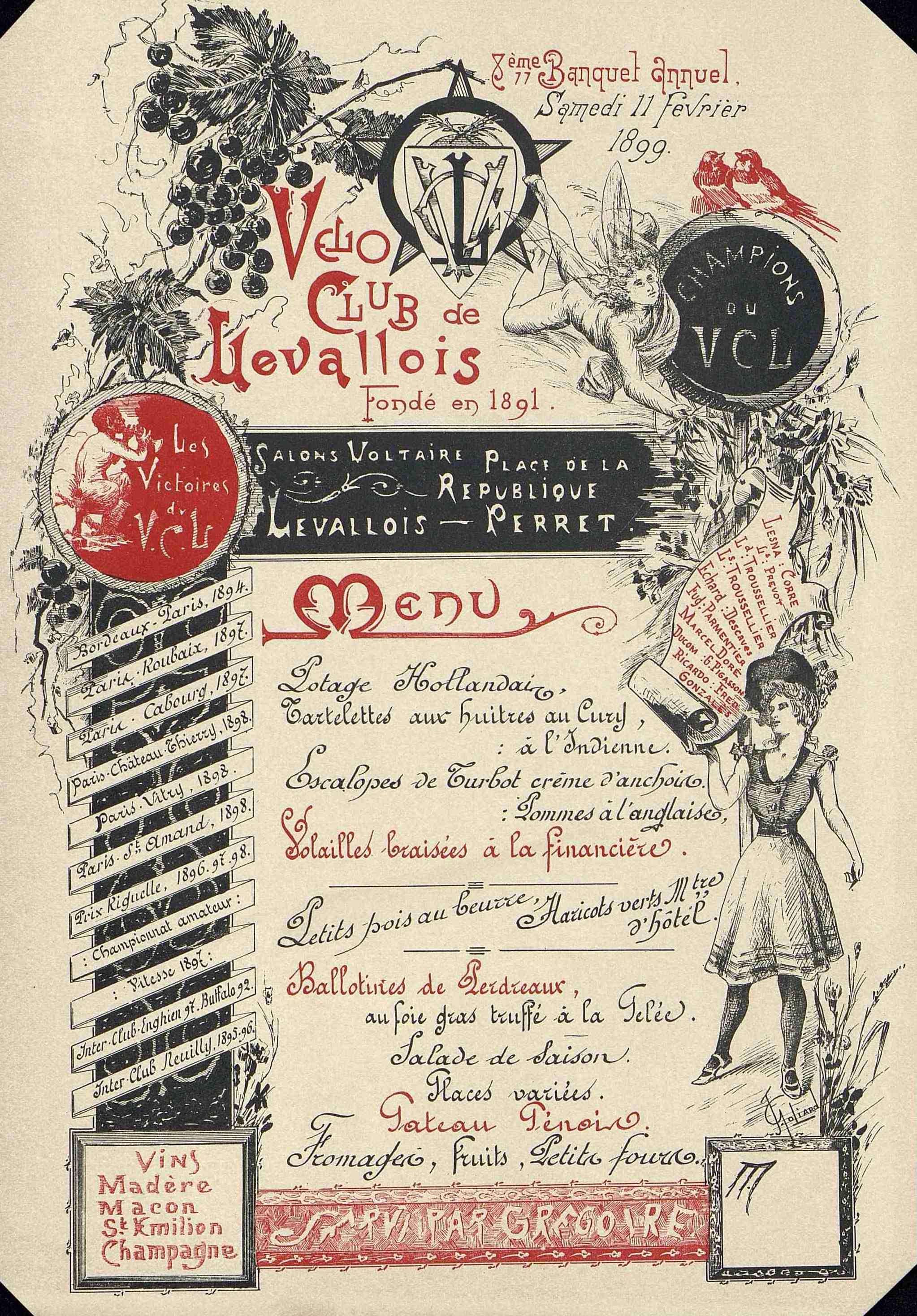 Illustration : médaillon avec un faune jouant du hautbois. Pampre. Sigle et blason du club. Ecu d'argent au V et C d'azur au L de sable entrelacés surmonté de deux rameaux de blé reposant sur trois disques deux d'argent et un de sable sur une étoile à plusieurs émaux.