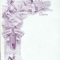 Menu vierge et publicitaire de l'Hôtel de la Gare à Angers. Illustration : pique nique romantique sur les bords de Loire avec en arrière-plan les monuments historiques de la ville de Saumur pour la publicité commerciale de l' Elixir Combier.
