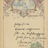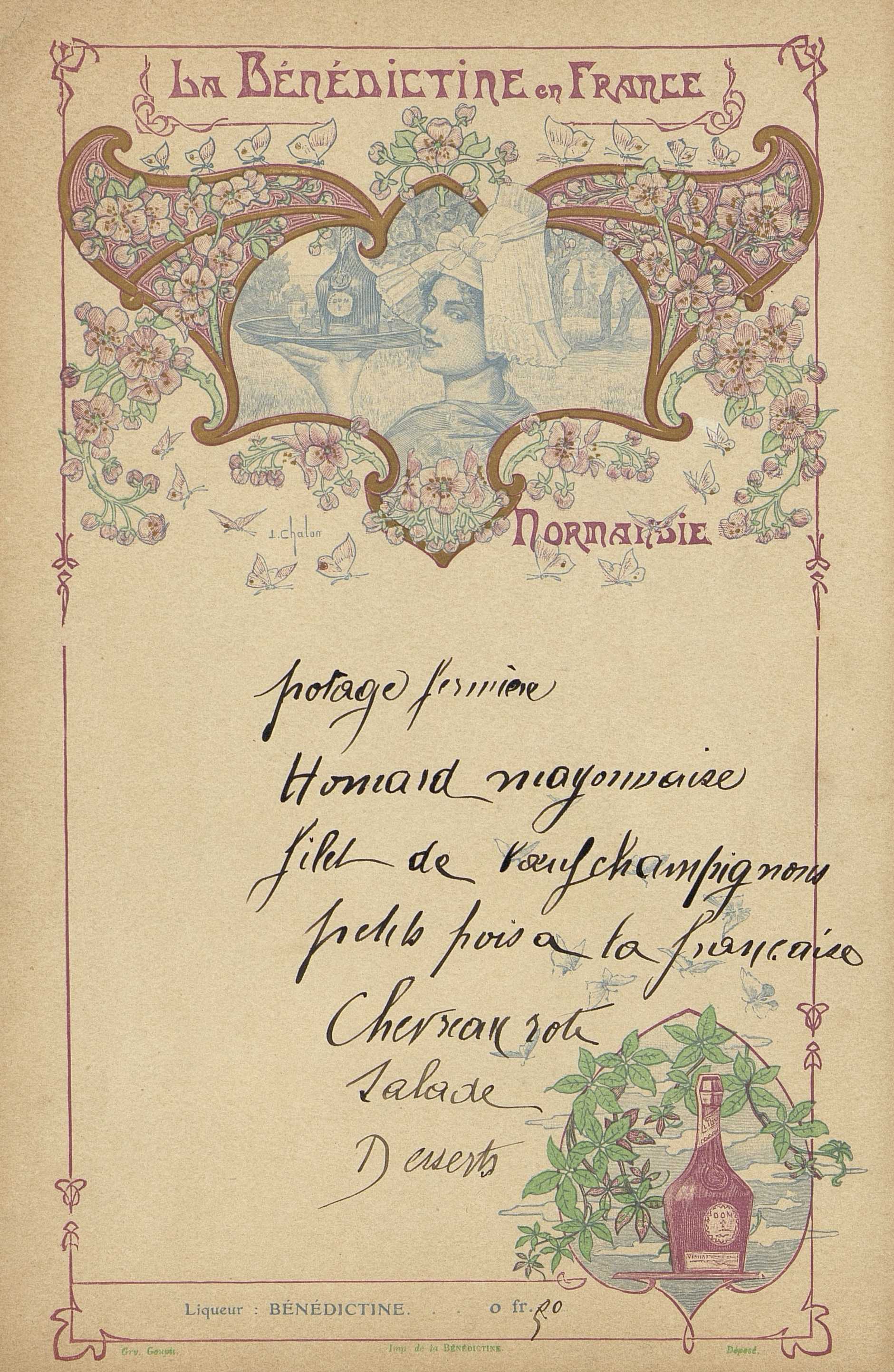 Menu à thème : la Normandie, non attribué, ni daté et localisé. Publicité pour la Bénédictine. Série des régions de France.
