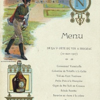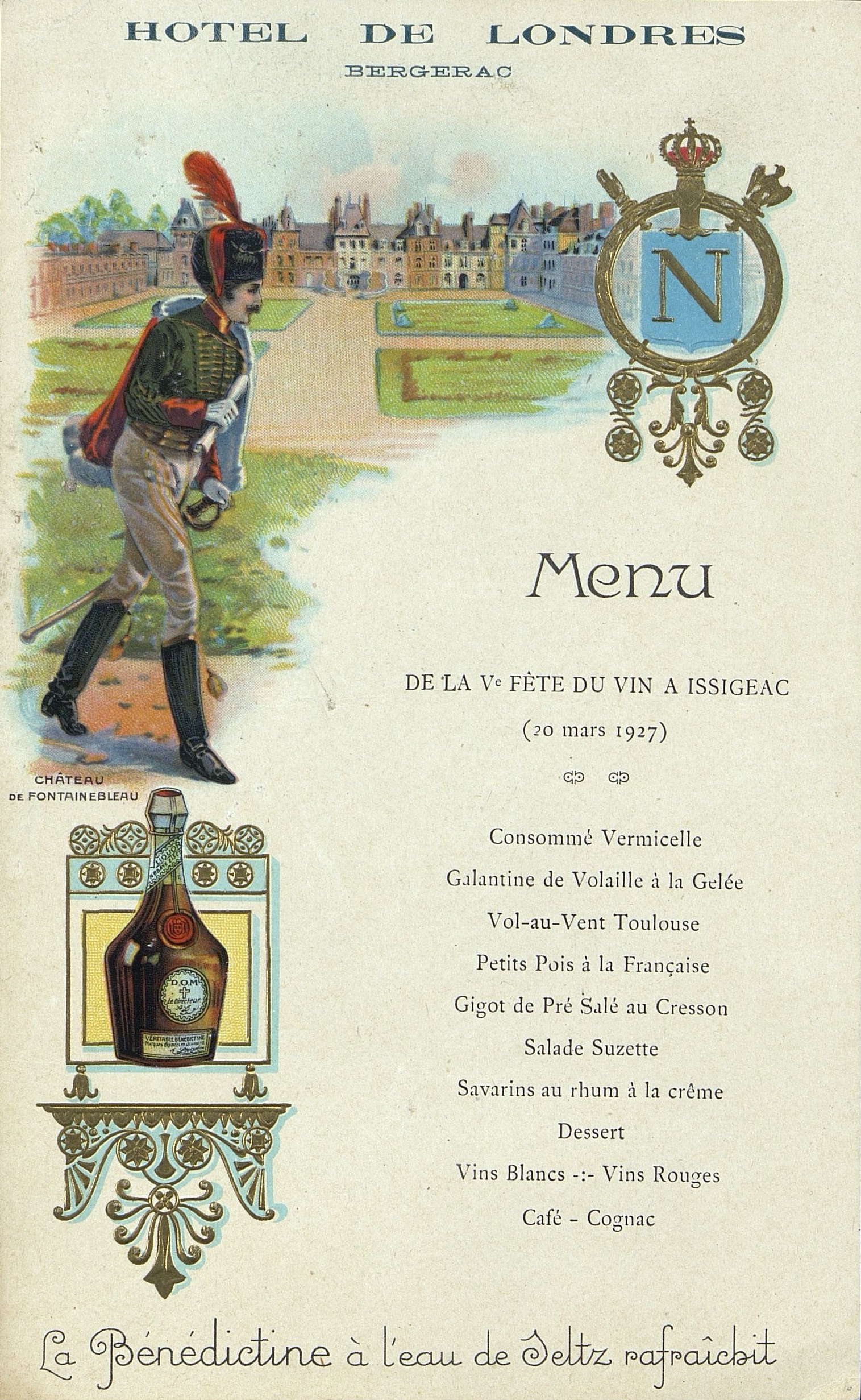Menu de la Ve fête du vin à Issigeac avec un hussard dans le parc du Château de Fontainebleau. Publicité pour la Bénédictine. Monogramme de Napoléon.