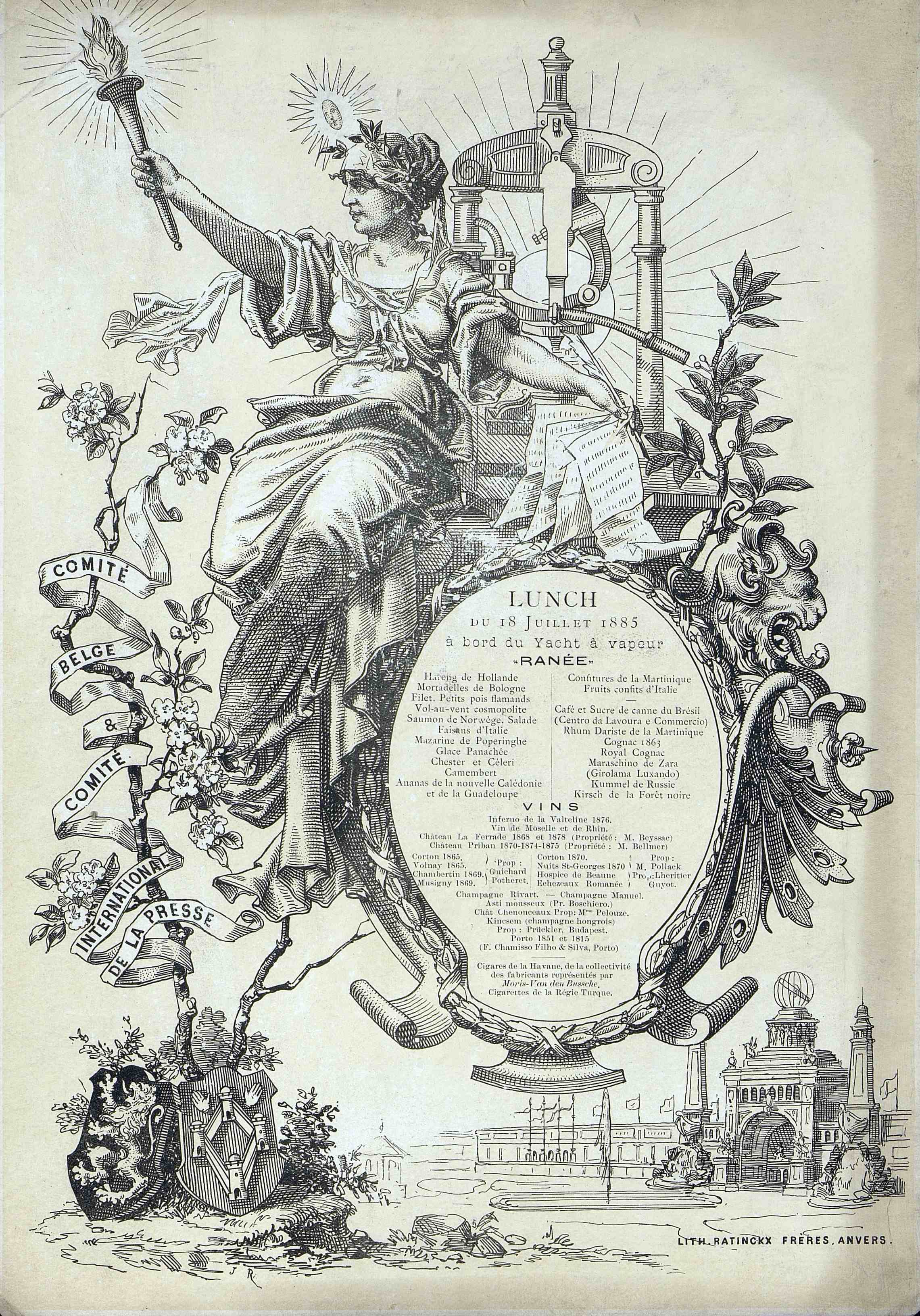Illustration : Allégorie de la presse. Armes de Flandres : Écu à bordures échancrées et bossée : "d'or au lion de sable armé et lampassé de gueules". Armes anciennes d'Anvers: Écu à bords échancrés et bossé "De gueules au château à quatre tours ouvertes crénelées en argent, ajourées et maçonnées de sable, accompagnée en chef de deux mains appaumées, celle à dextre en bande, celle à senestre en barre, toutes les deux en argent. Pavillon de l'exposition universelle d'Anvers de 1885.