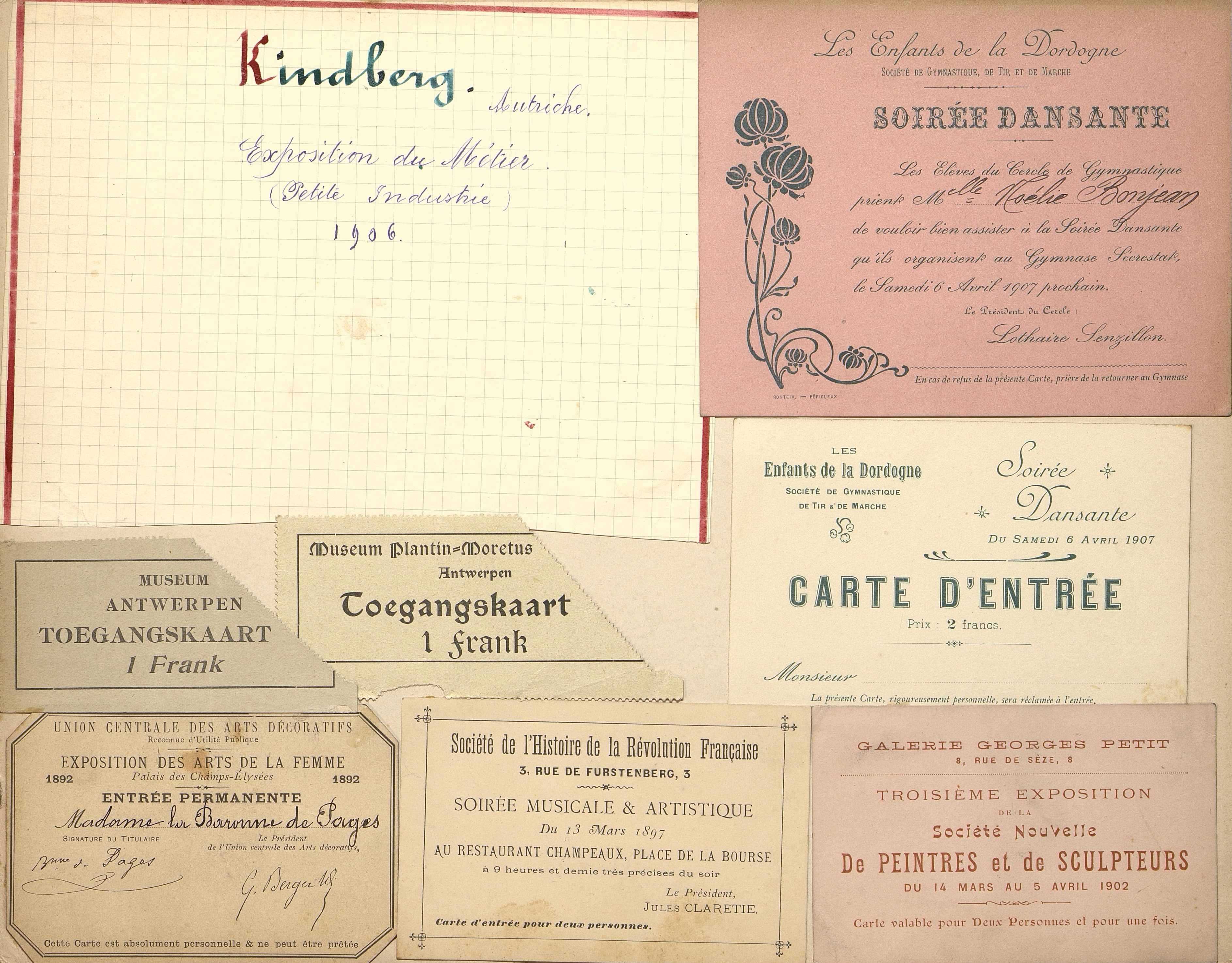Soirée dansante organisée par Les Enfants de la Dordogne, Société de Gymnastique de Tir et de Marche. Carte attribuée à Mlle Noélie Bonjean. Datée du 6 avril 1907.
