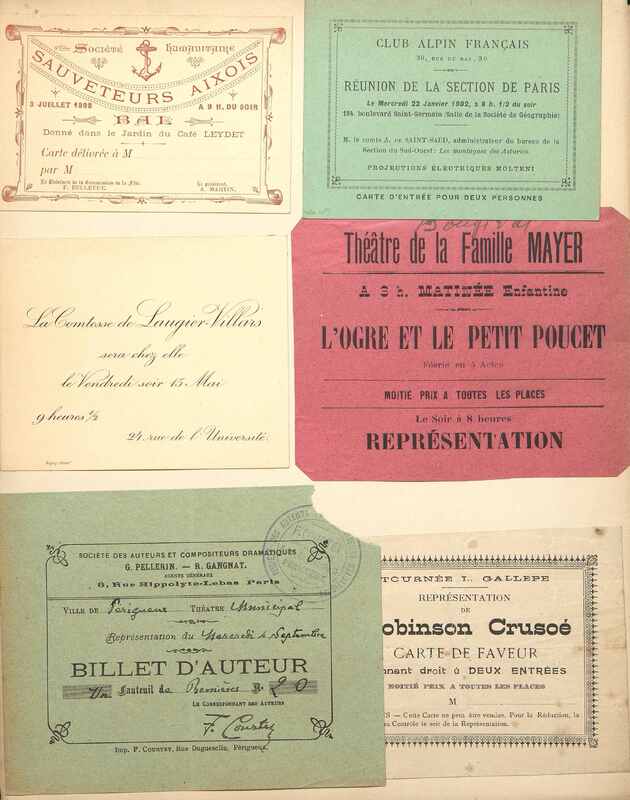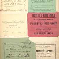 Planche avec diverse thématique ; Sauveteurs Aixois, Club Alpin français et des billets de théâtre.