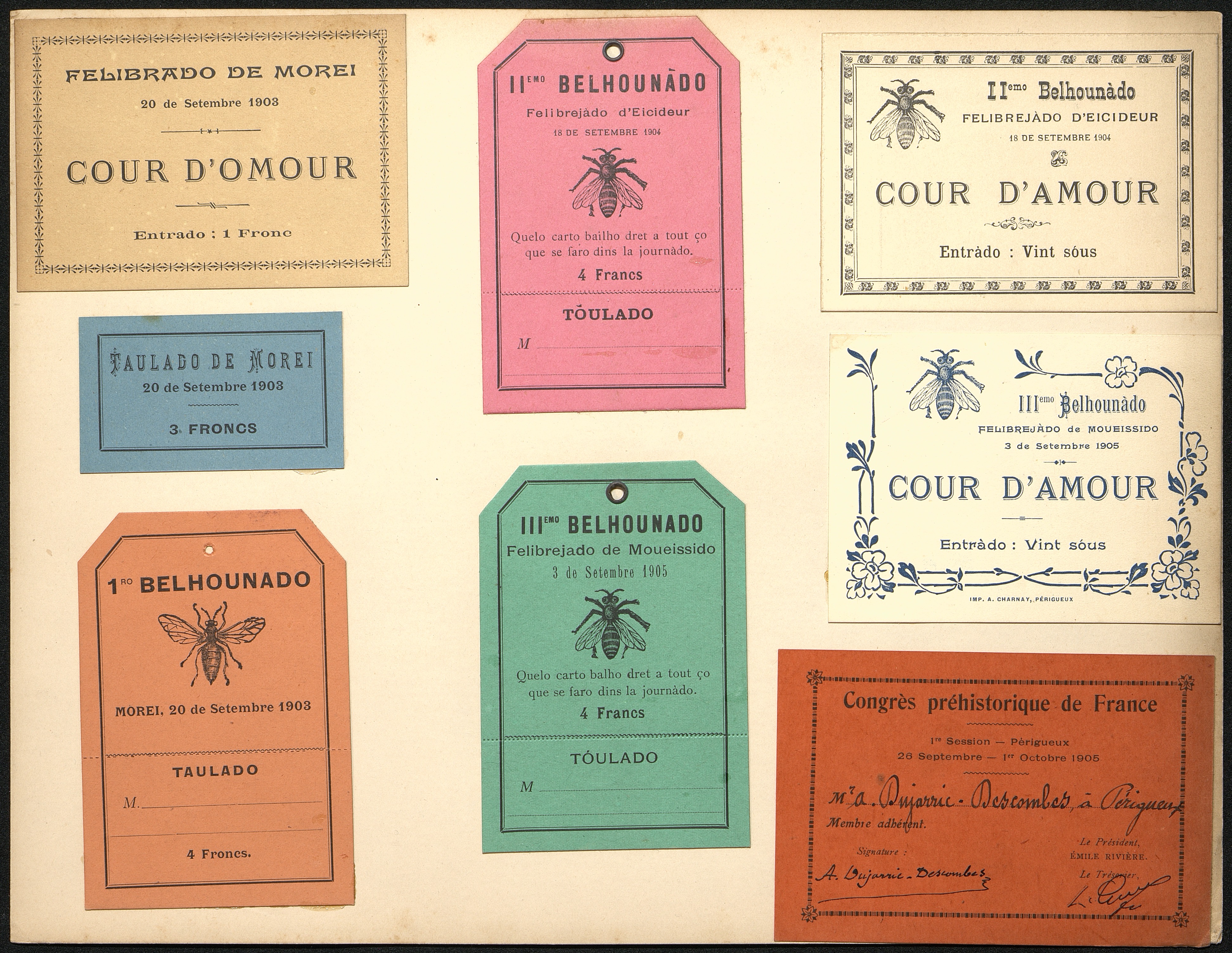 7 Tickets pour plusieurs Félibrées et cour d'Amour. Mareuil 1903 ; Excideuil 1904 ; Mussidan 1905.