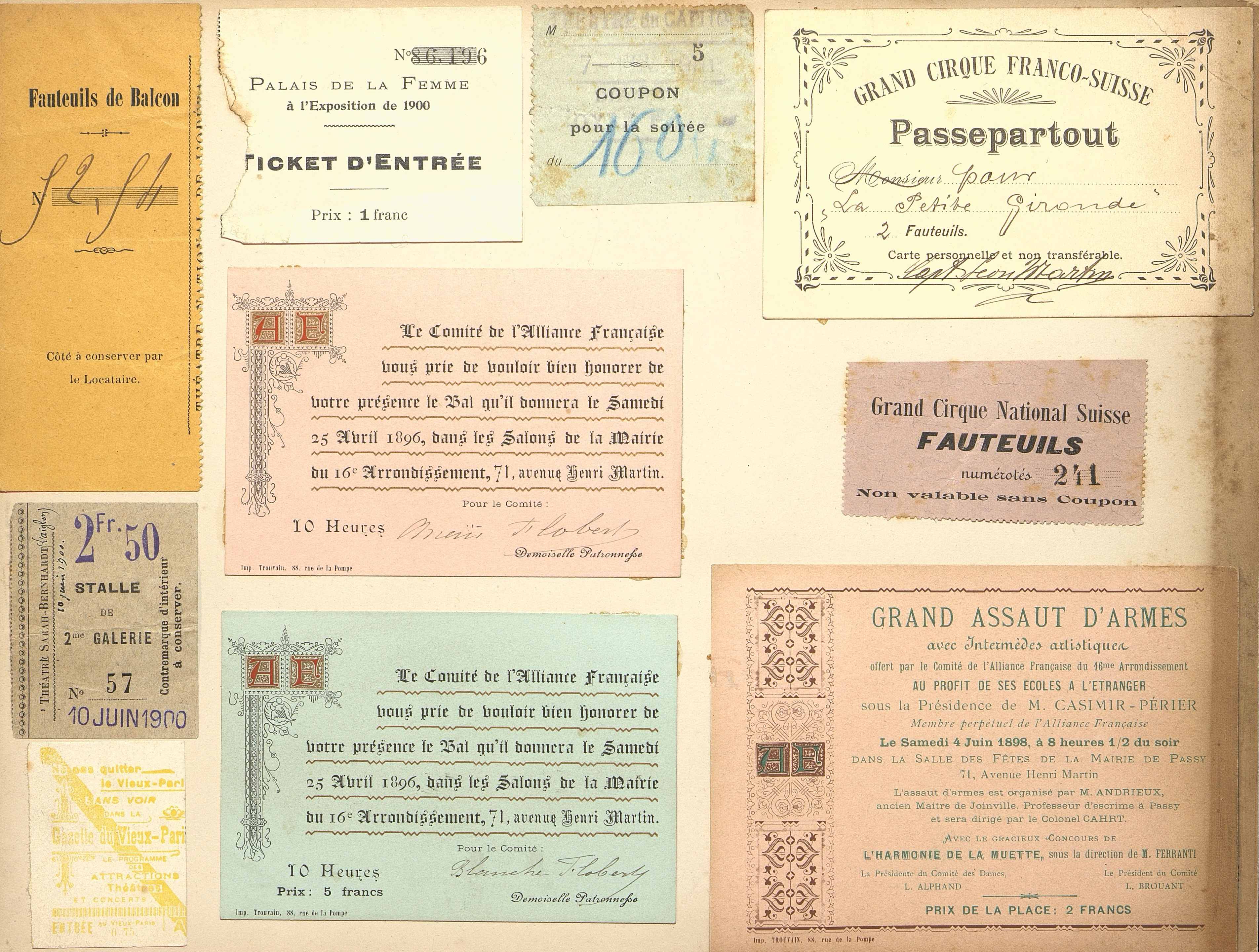 Deux invitations de l'Alliance Française pour un bal à la Mairie du 16e arrondissement de Paris en date du 25 avril 1896. imp. Trouvain à Paris.