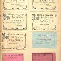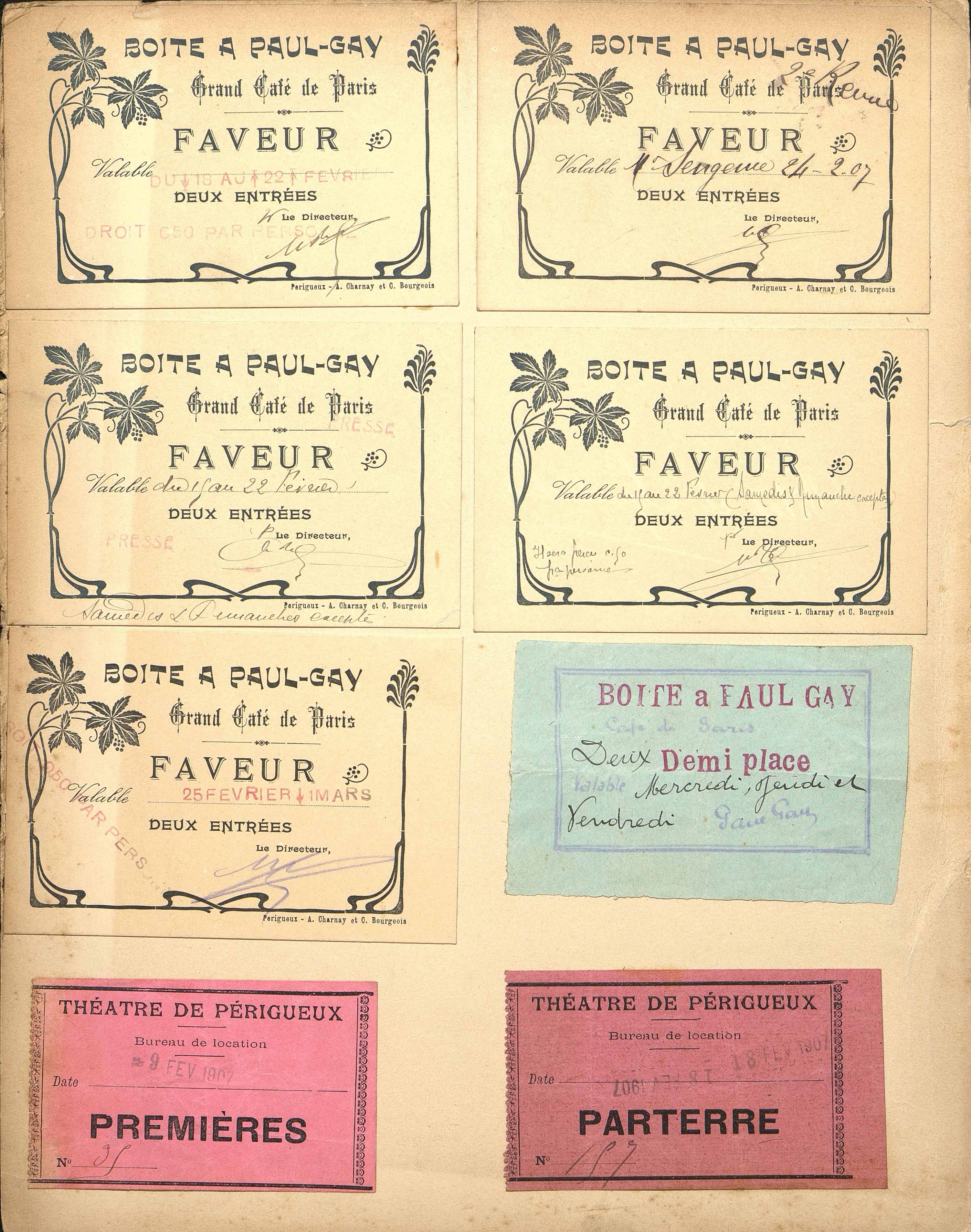 Série de billets de faveur pour la Boite à Paul Gay, Grand Café de Paris. L'un de ces billet est attribué a M. Sengence et porte la date du 2 février 1907. Le Grand Café de paris est localisé à Périgueux.
