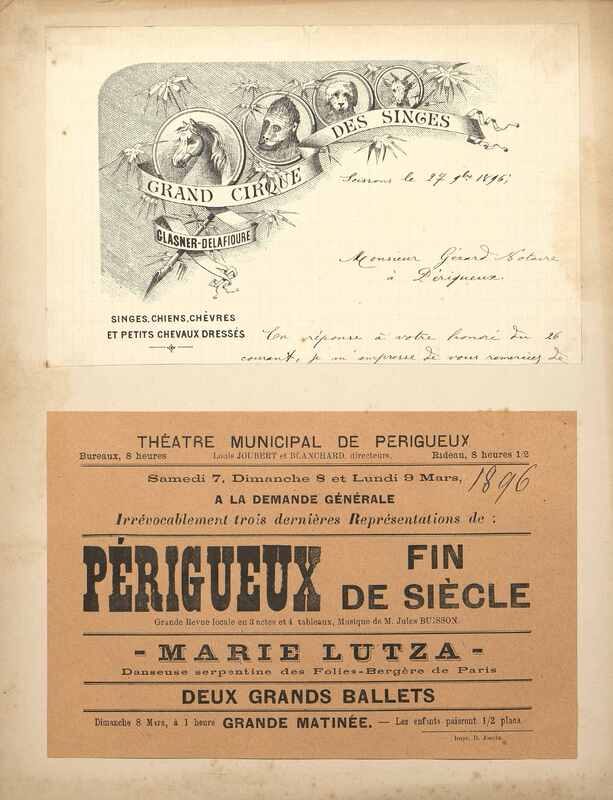 Partie d'une lettre à entête : Grand Cirque des Singes. Glasnier-Delafioure, adressée à M. Gérard Notaire à Périgueux, datée du 27 novembre 1896.