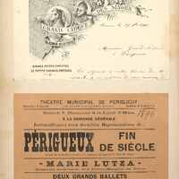 Tract pour le spectacle : Périgueux fin de siècle au Théâtre Municipal de Périgueux. Également sur ce programme, deux ballets, et Marie Lutza, danseuse. Daté des 7,8,9 mars 1896.