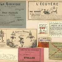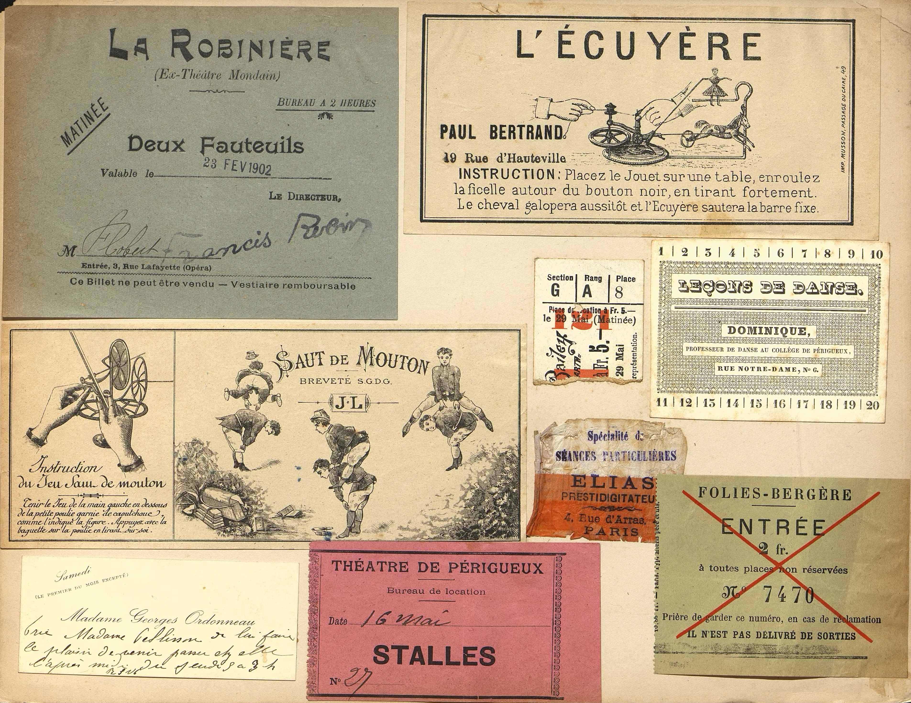 Planche avec tickets de spectacles et diverses publicités d'attractions.