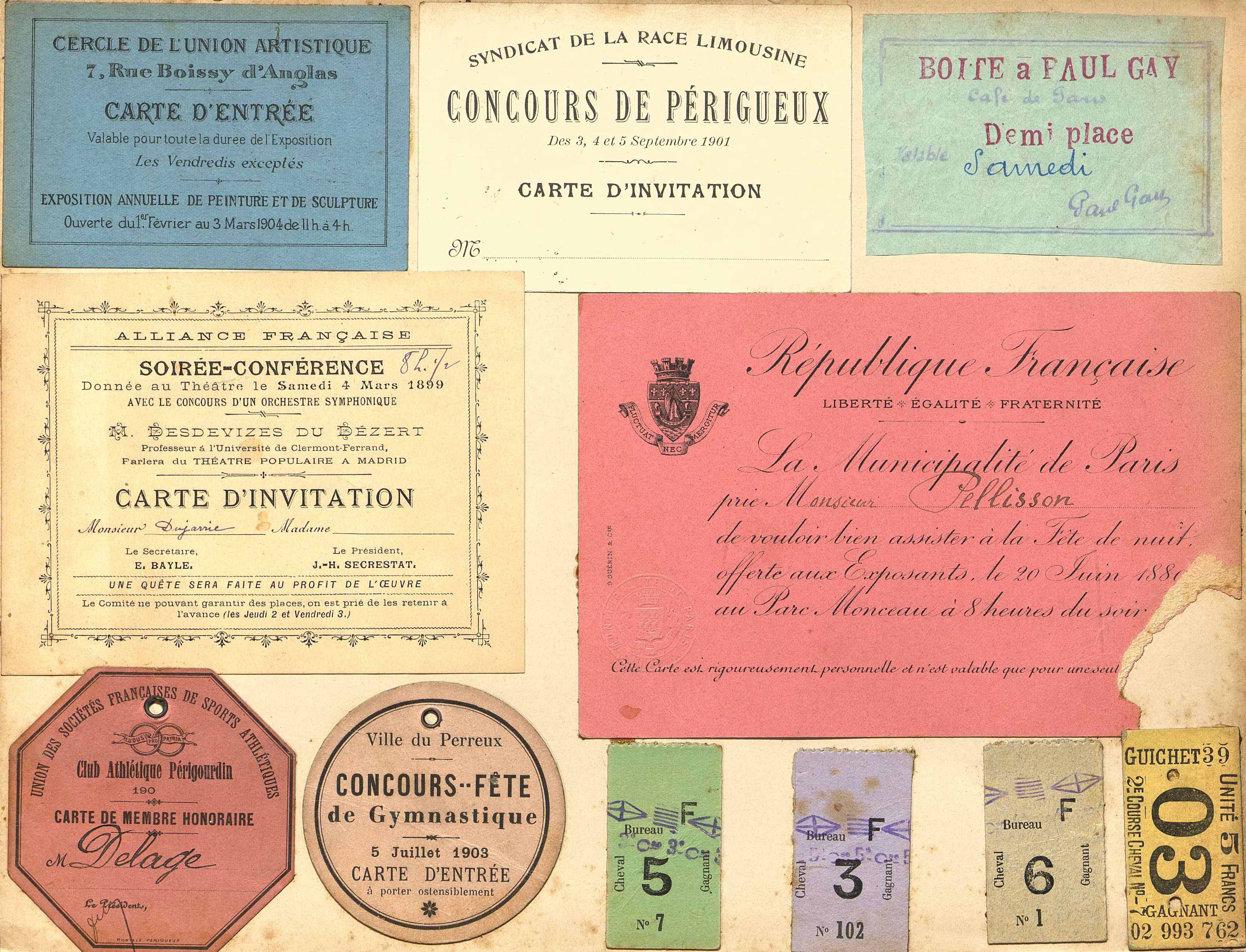 Carte d'invitation à une conférence donnée au Théâtre de Périgueux par M. Desdevizes du Dezert de l'Alliance française. Présence d'un orchestre symphonique. Carte attribuée à M. Dujarric. Samedi 4 mars 1899.