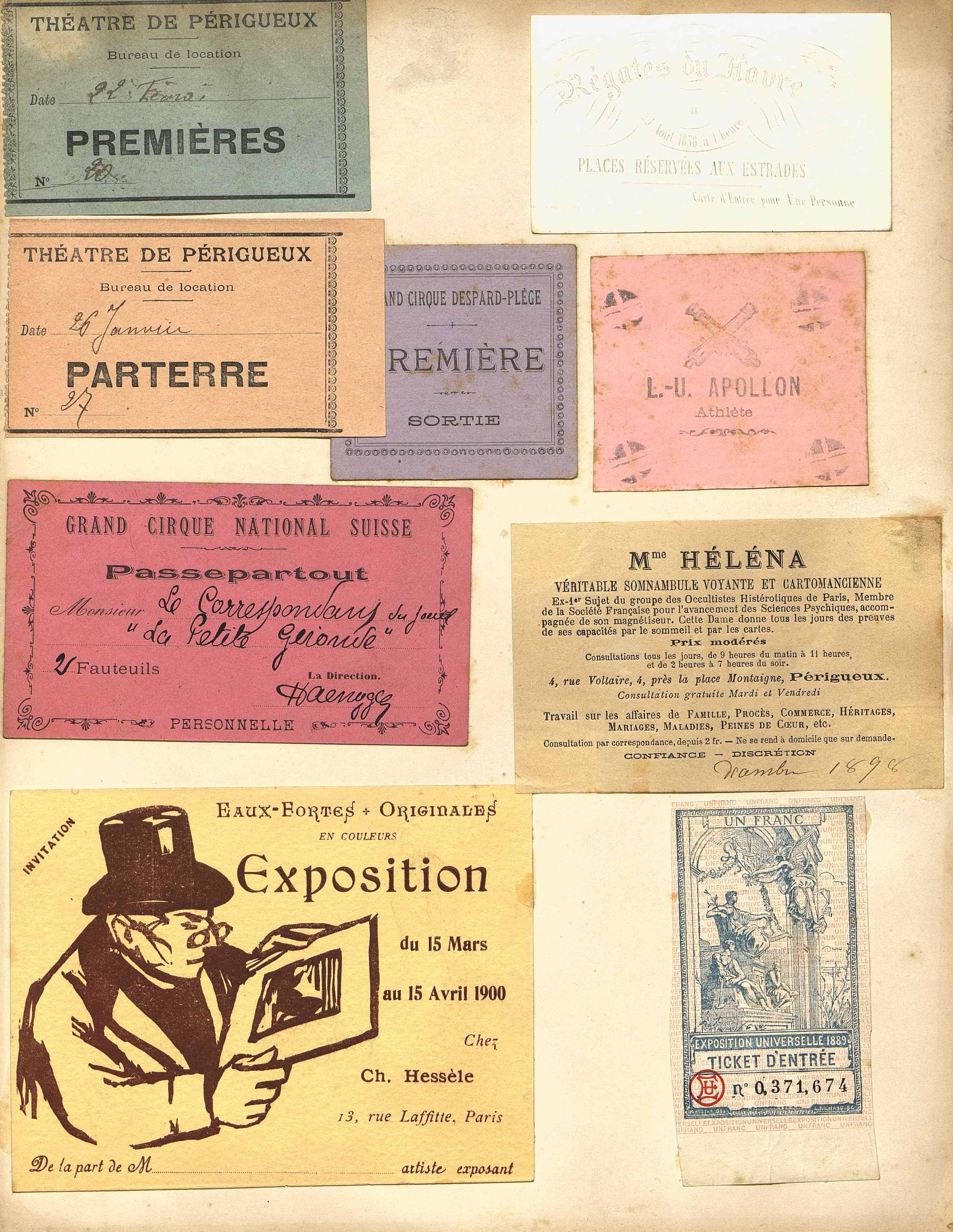 Passepartout du Grand Cirque National Suisse adressé au correspondant du journal La Petite Gironde. Signature illisible [s.d.]