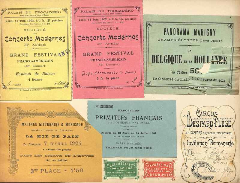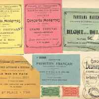 2 Billets détachables pour un Grand Festival Franco-Américain au palais du Trocadéro, grande salle des fêtes par la Société des Concerts Modernes pour le jeudi 12 juin 1902. Mentions manuscrites et trace de tampon encreur.