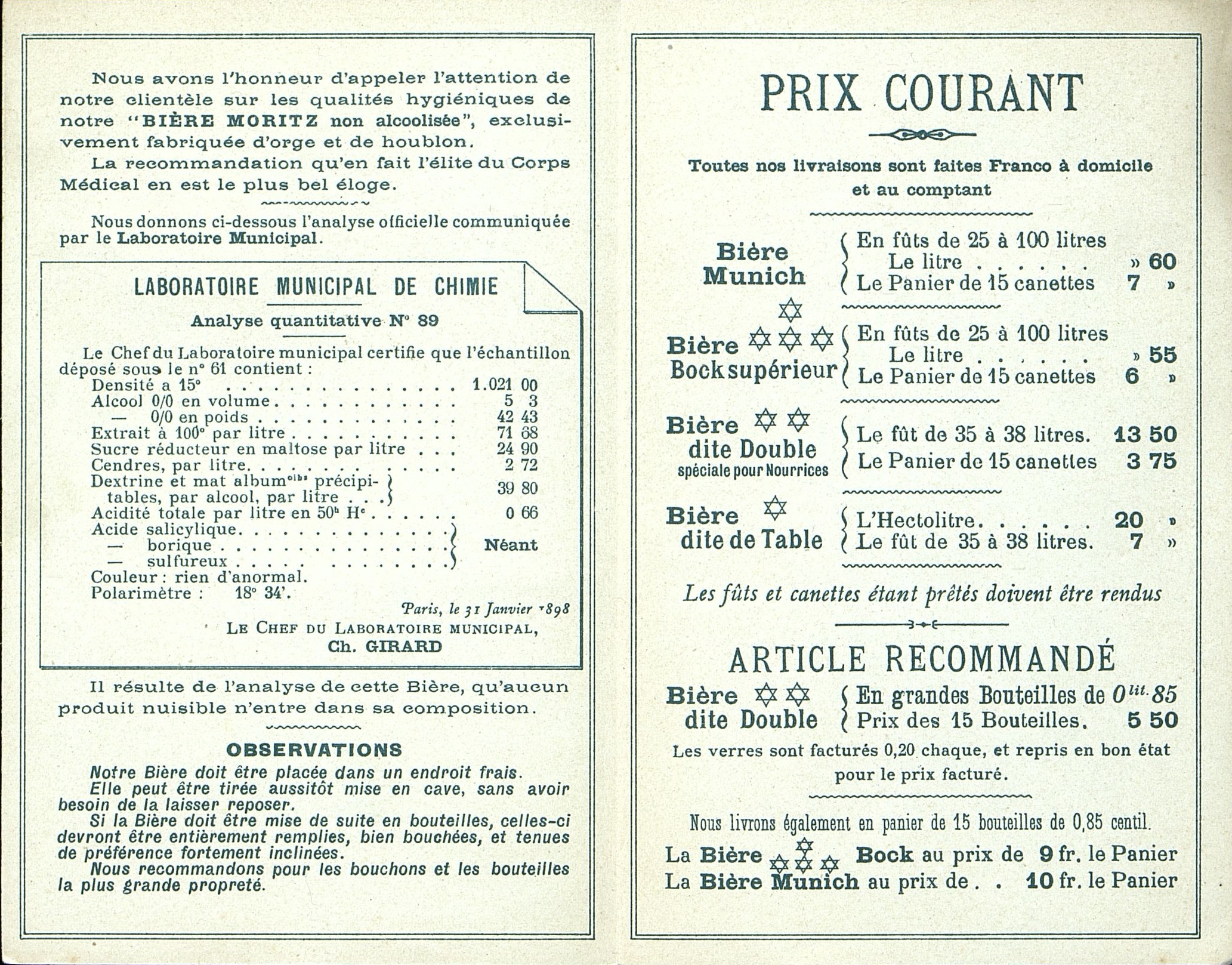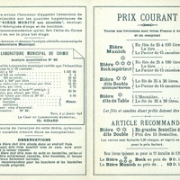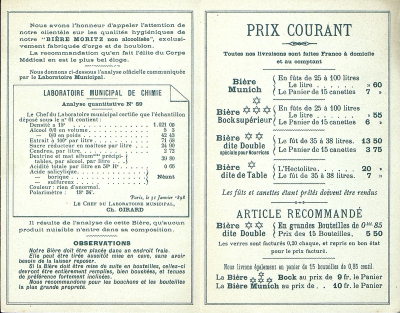 Dépliant publicitaire illustré pour une bière sans alcool. La brasserie figure en dessin, et à l'intérieur du dépliant se trouve la présentation du produit, les tarifs et conditions de vente. Il existe une possibilité que cette bière soit casher.