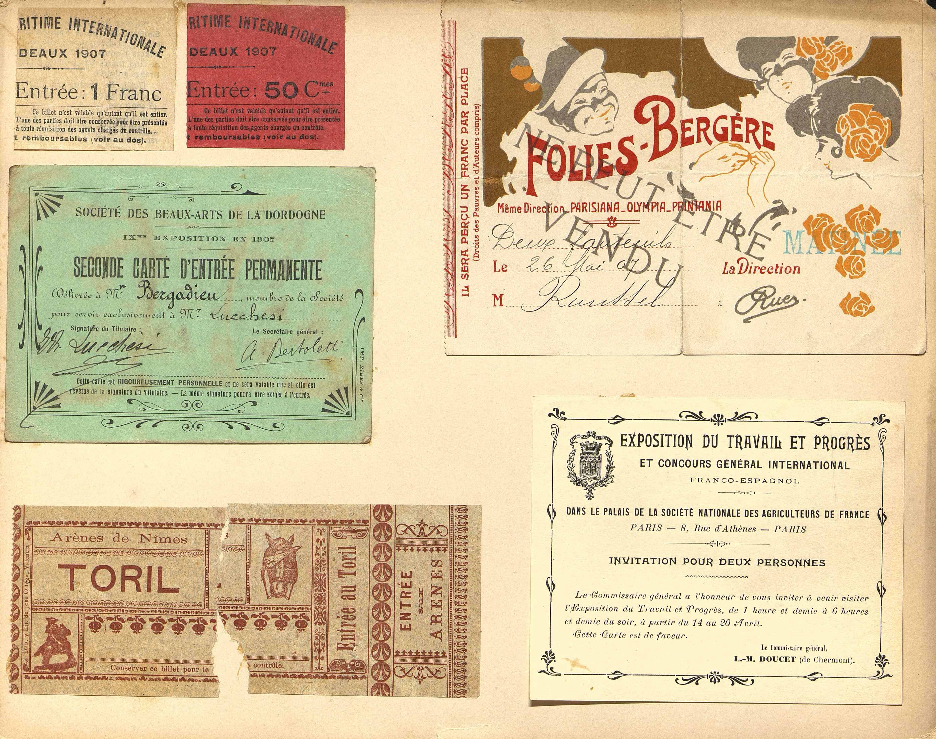 Un billet d'entrée illustré aux Folies-Bergères. Mentions manuscrites sur cet imprimé : Deux fauteuils, 26 mai 1907, Daussel.
