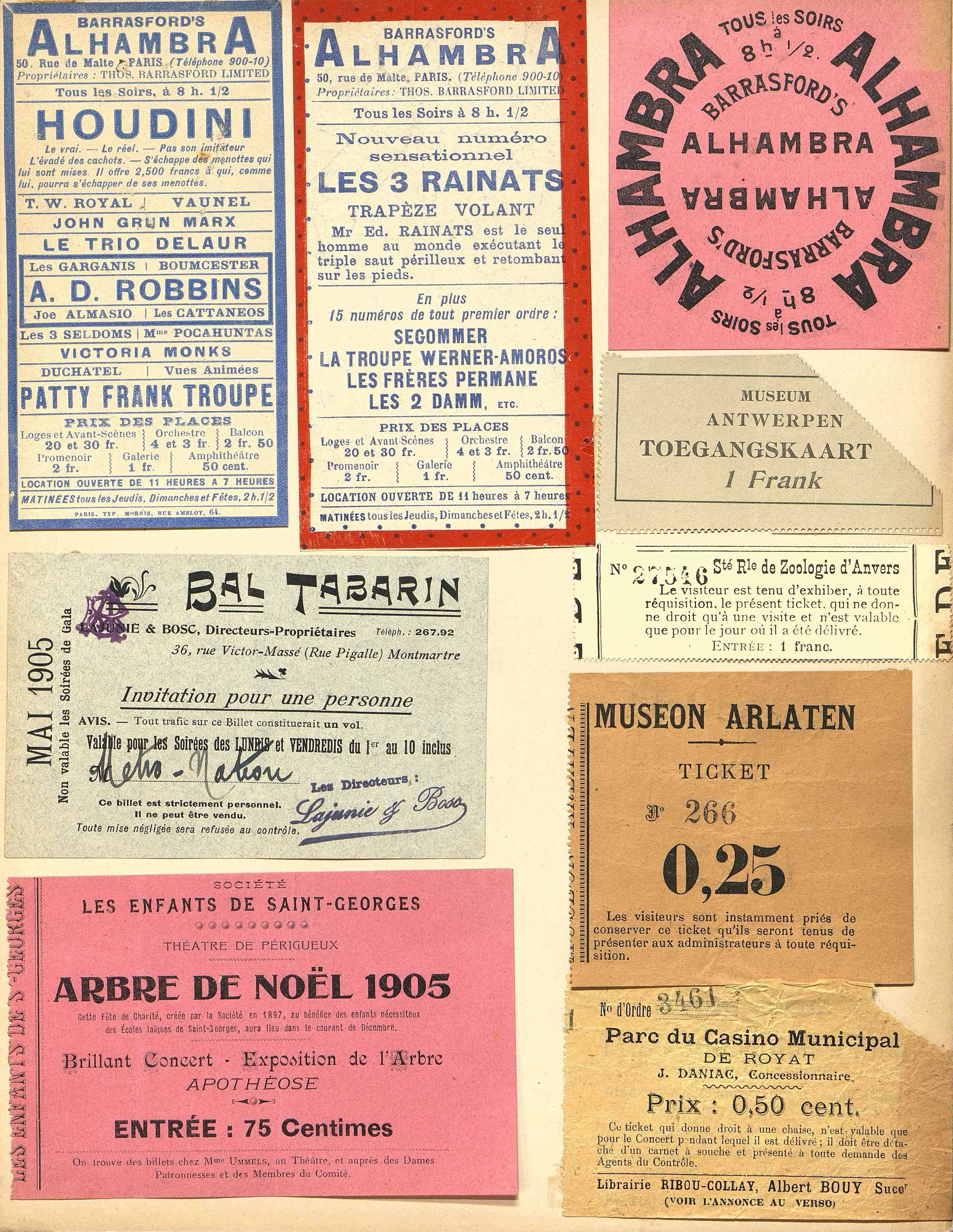 2 tracts publicitaires du Barrasford's Alhambra, l'un mettant en vedette Houdini, le second Les Trois Rainats des trapézistes. [s.d.]