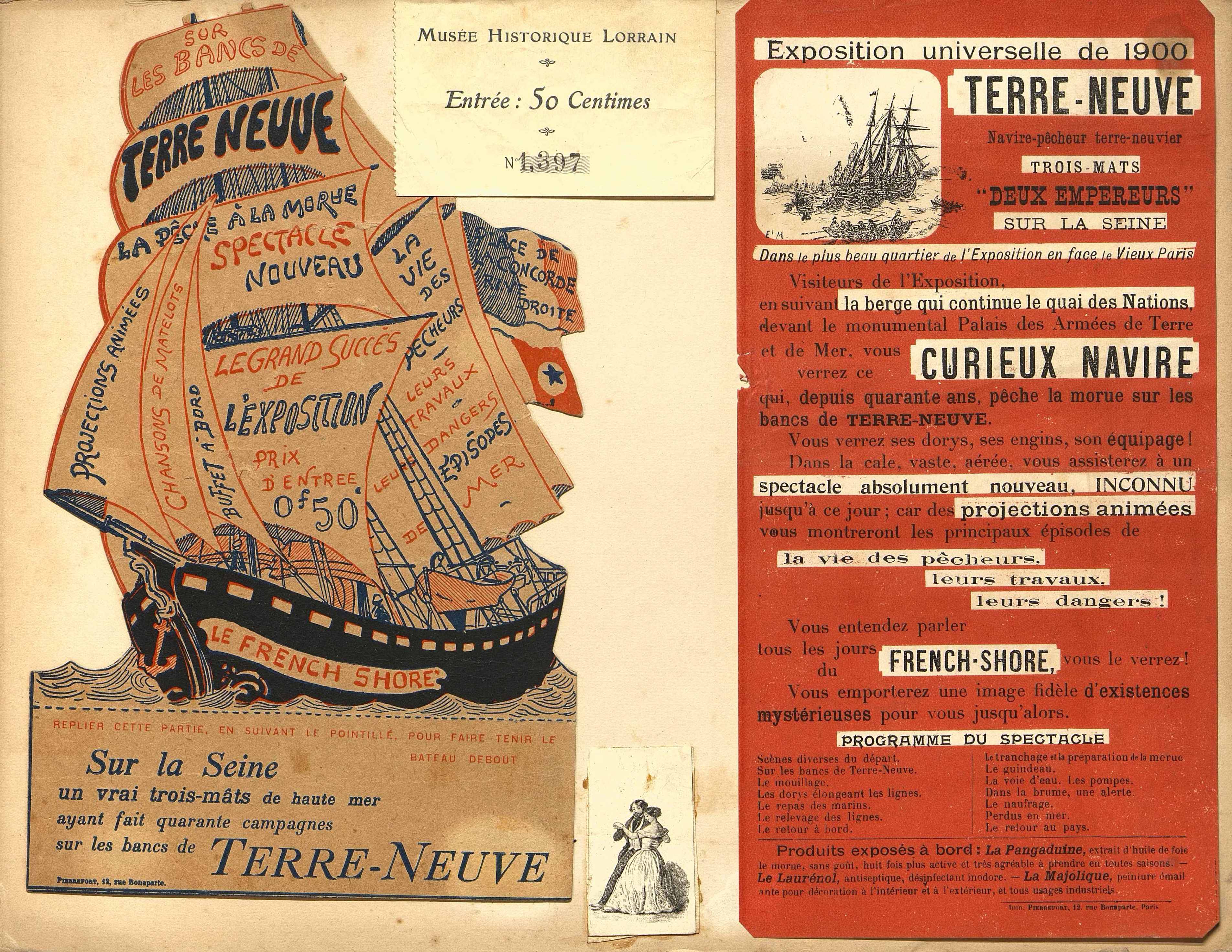 Dépliant publicitaire illustré : Sur les bancs de Terre-Neuve, la pêche à la morue : Terra-Neuvas à l'Exposition Universelle de 1900. Spectacle, exposition d'un navire sur la Seine, avec de nombreuses reconstitutions.