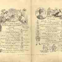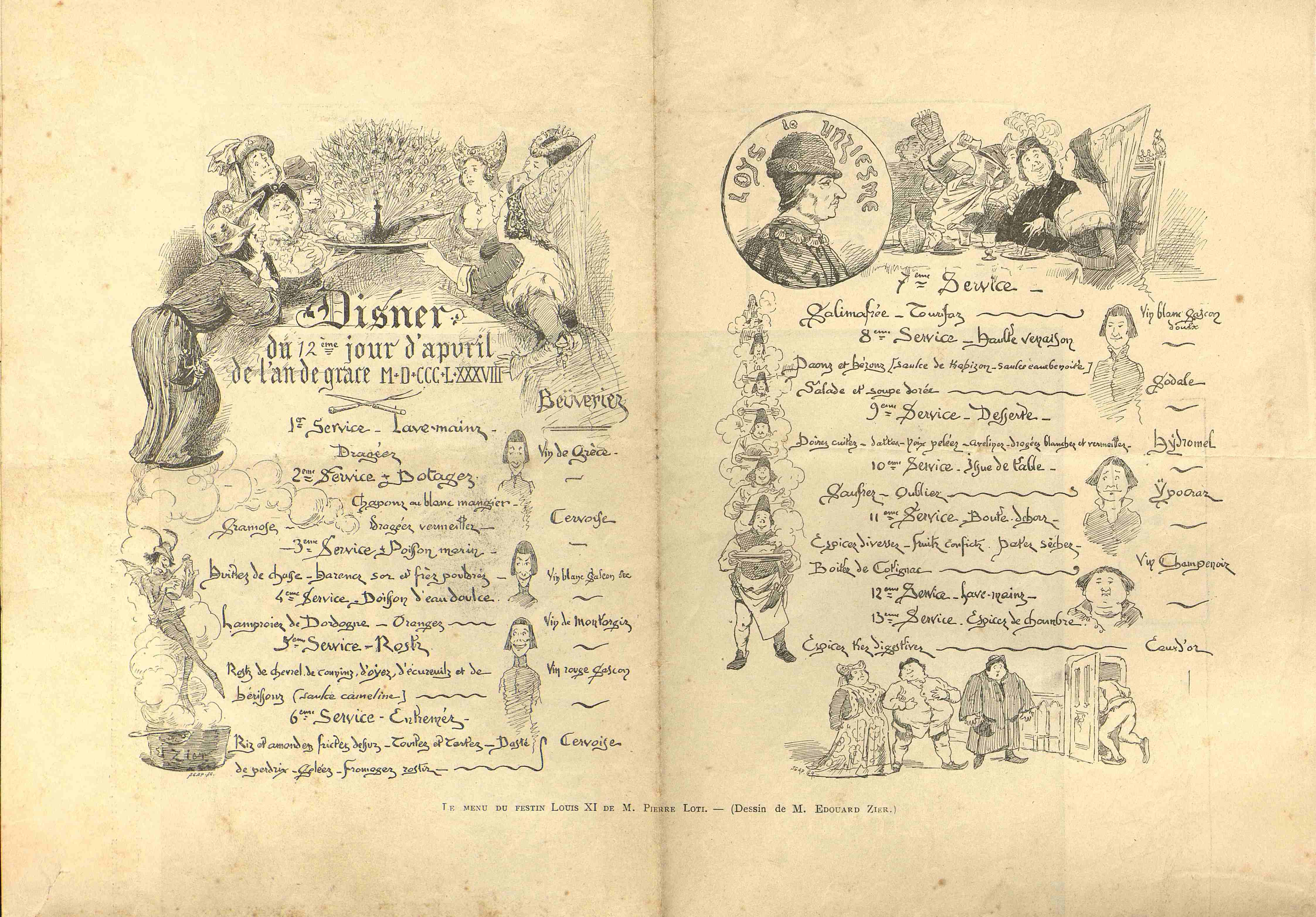 Plats servis : 1er service. Lave-mains.2e service + Potages. Chapons au blanc mangier. Dragées vermeilles. 3e service + Poisson marin. Huîtres de chasse. Hareng saur et frais poudrés. 4e service + poisson d'eau douce.Lamproies de Dordogne. Oranges.5e service Rôts : Roti de chevreuil de convins, d'oyes, d'écureuils de bérifjouz (sauce cameline).6e service : Entremets