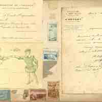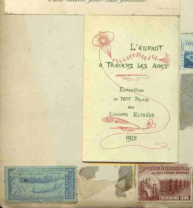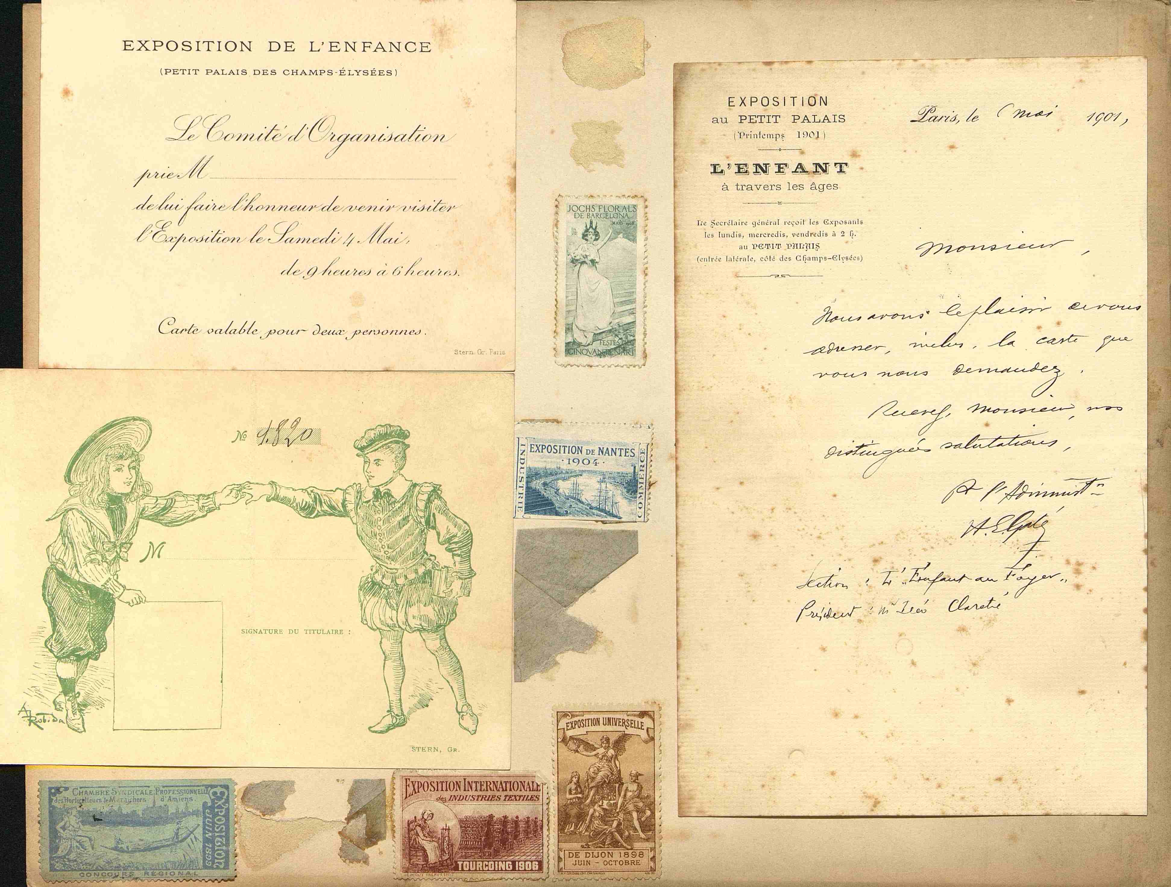 Planche dédié à l'exposition de l'enfance : L'Enfant à travers les âges., avec deux cartons d'invitation vierges. Exposition au Petit-Palais des Champs-Elysées.1901. imp. Stern.