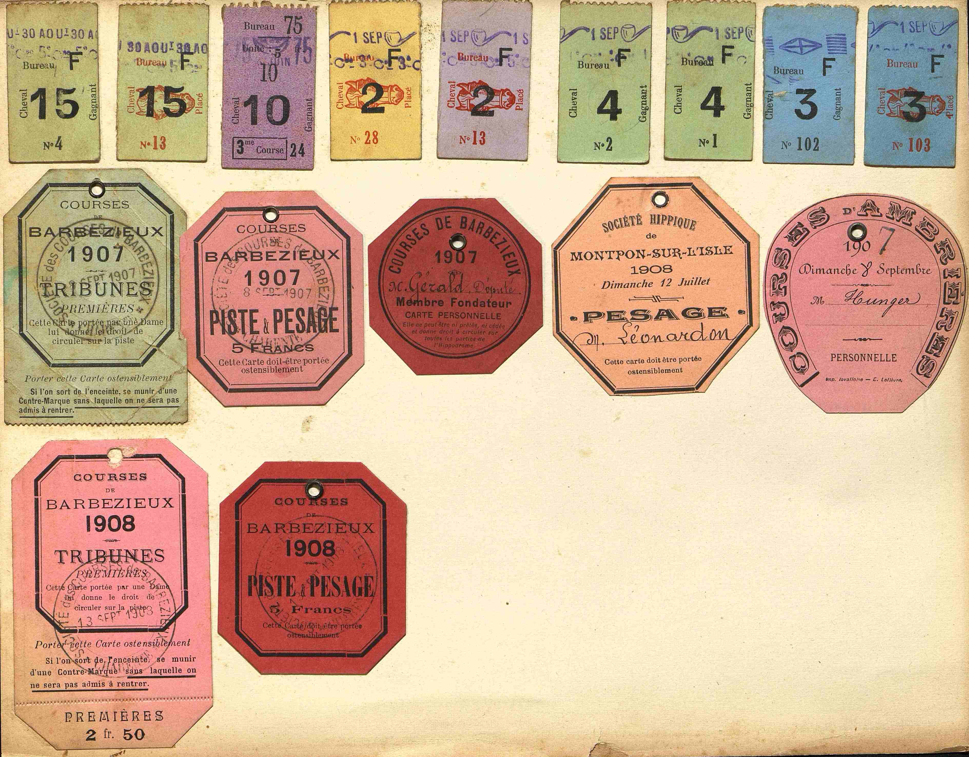 5 cartes d'accès au pesage, aux tribunes lors des courses de Barbezieux. Années 1907 et 1908.