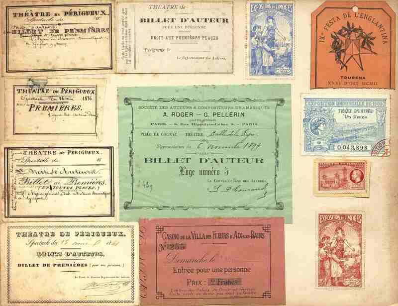Planche sur le thème du théâtre et de billets d'auteurs, souvent de Périgueux. Timbres commémoratifs.