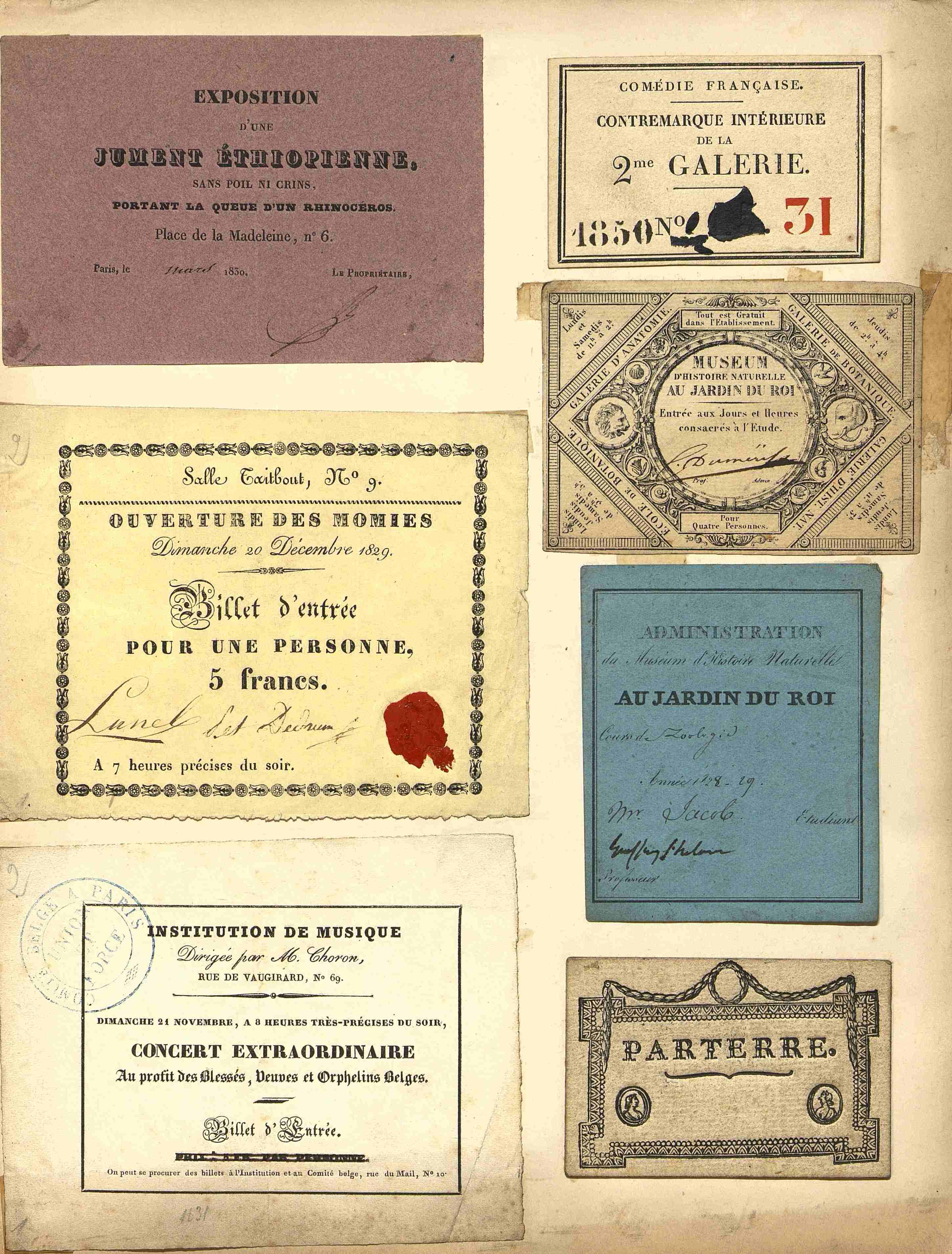 5. Billet d'entrée pour 4 personnes au Muséum d'Histoire naturelle, au Jardin du Roi. Signature illisible et non daté.