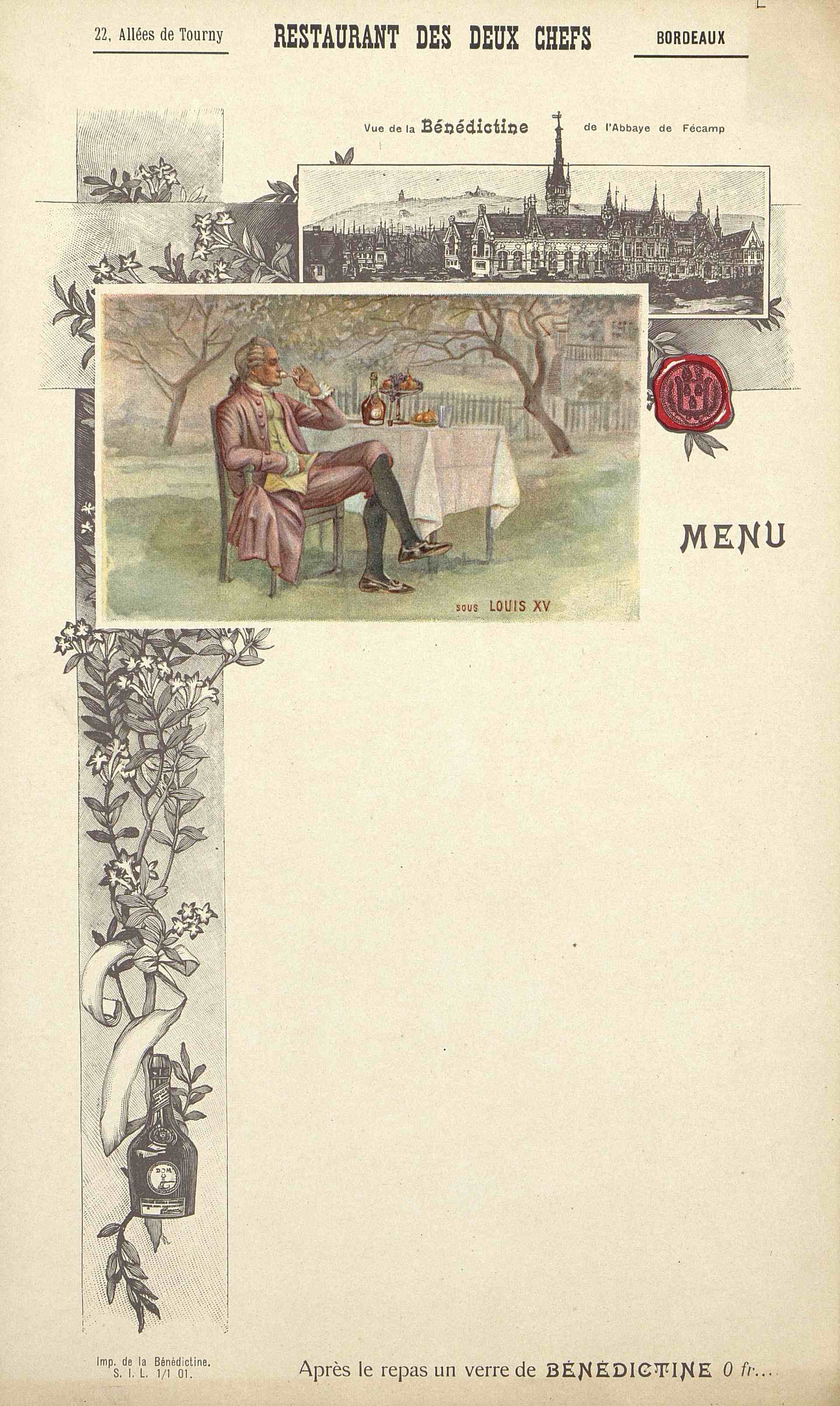 Menu vierge et publicitaire du Restaurant des Deux Chefs à Bordeaux, thème : "sous Louis XV"