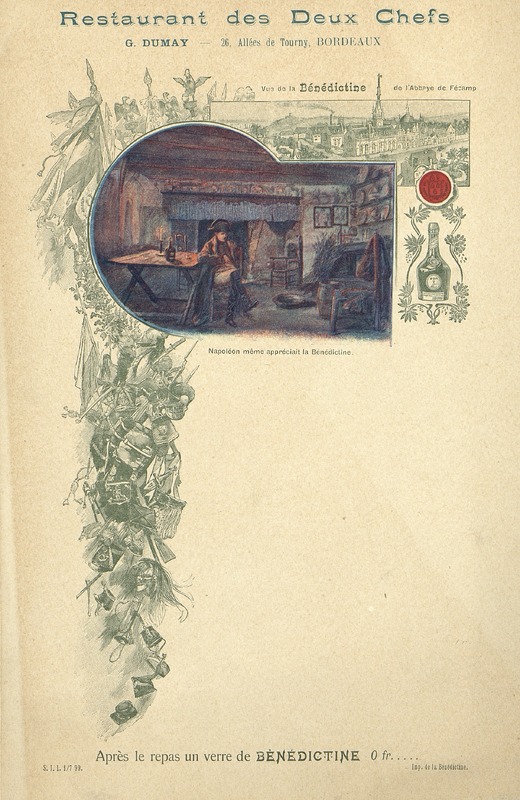 Menu publicitaire et illustré du Restaurant des deux Chefs à Bordeaux. Illustration avec Napoléon.