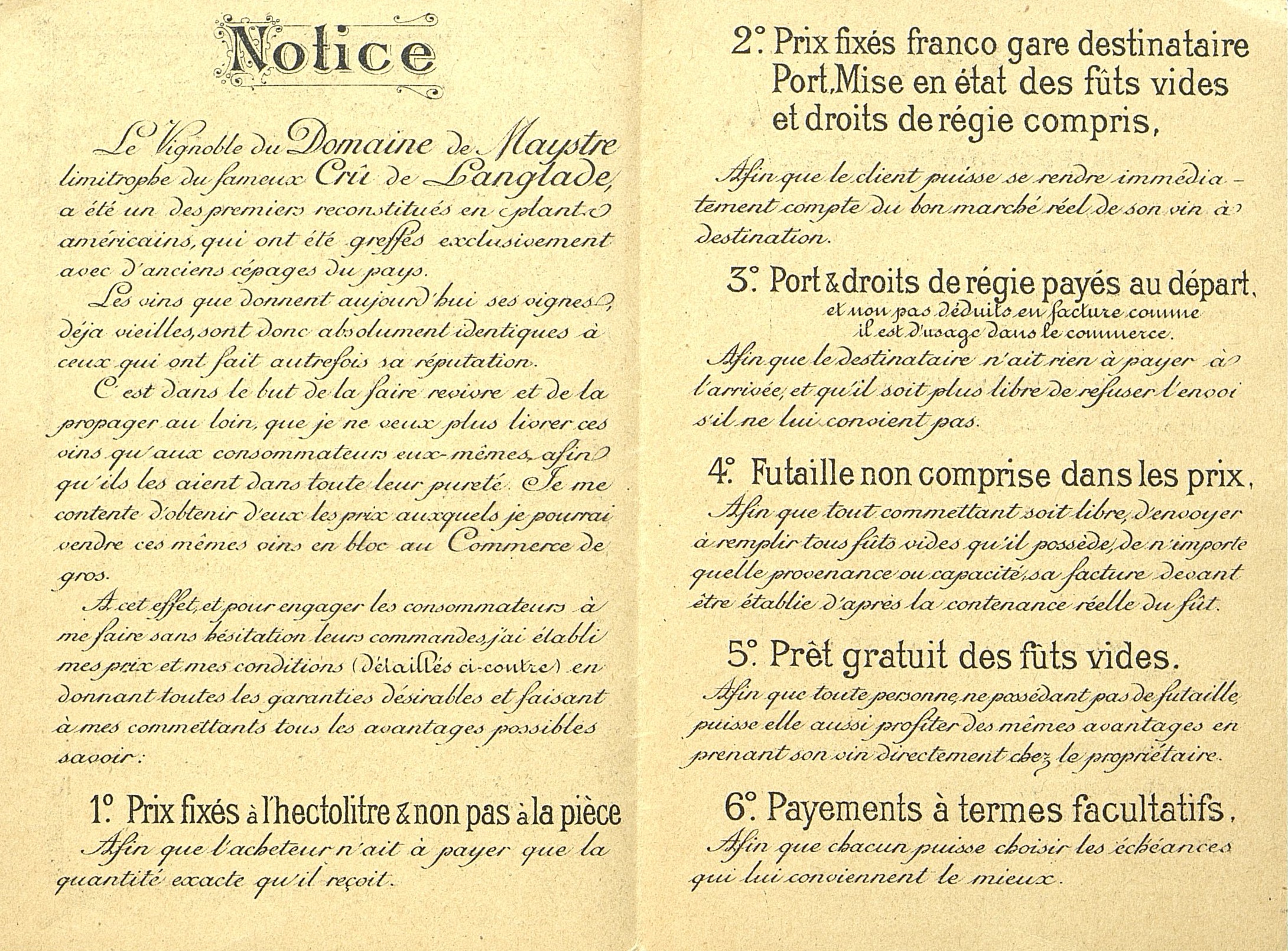 Dépliant publicitaire. Présentation des vins et des conditions de vente par correspondance.