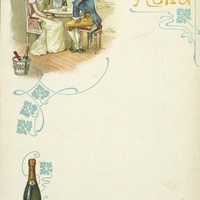 - Menu publicitaire vierge. Champagne ou mousseux Montebello. Illustration du XVIIIe s. Un couple attablé, avec la femme s'éventant.