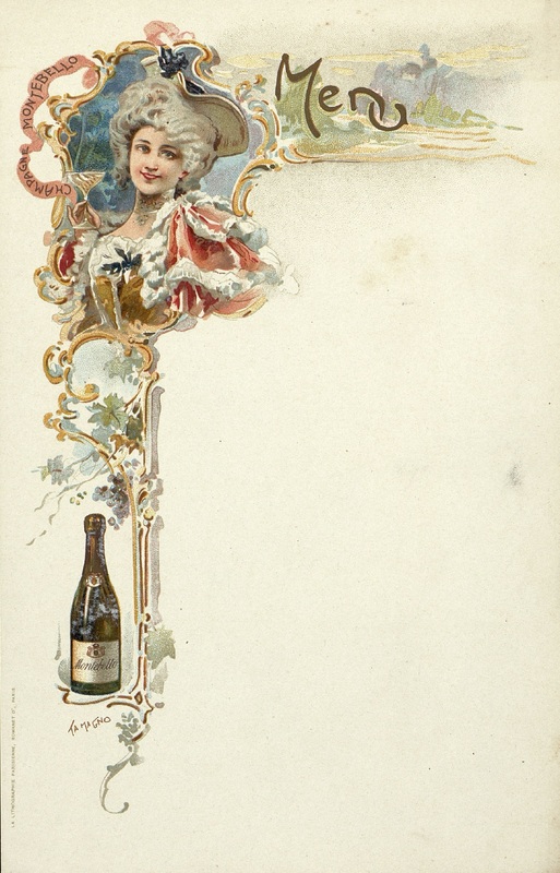 - Menu publicitaire vierge. Champagne Montebello. Buste de femme en habits style Pompadour.