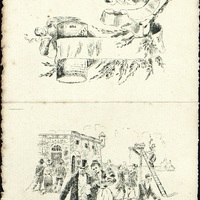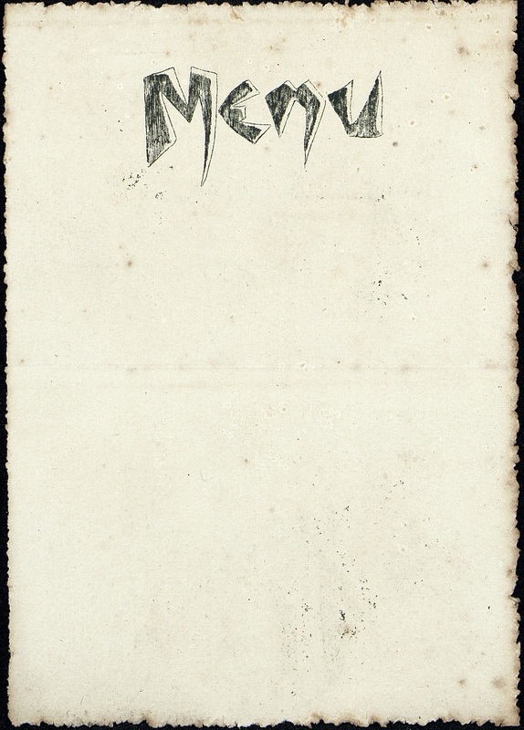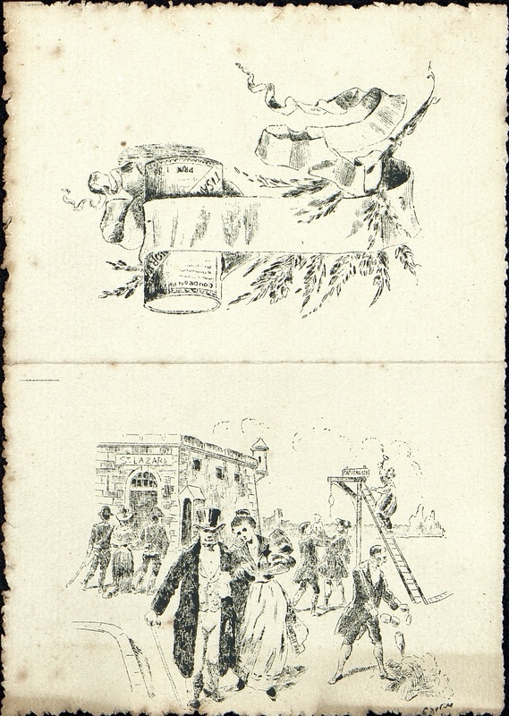 Menu vierge illustré formant une série. On distingue une potence avec inscrit : capitaliste. Une Femme à chapeau est encadrée de deux gendarmes se rendant vers St Lazare. Une homme fait bruler de papiers.
